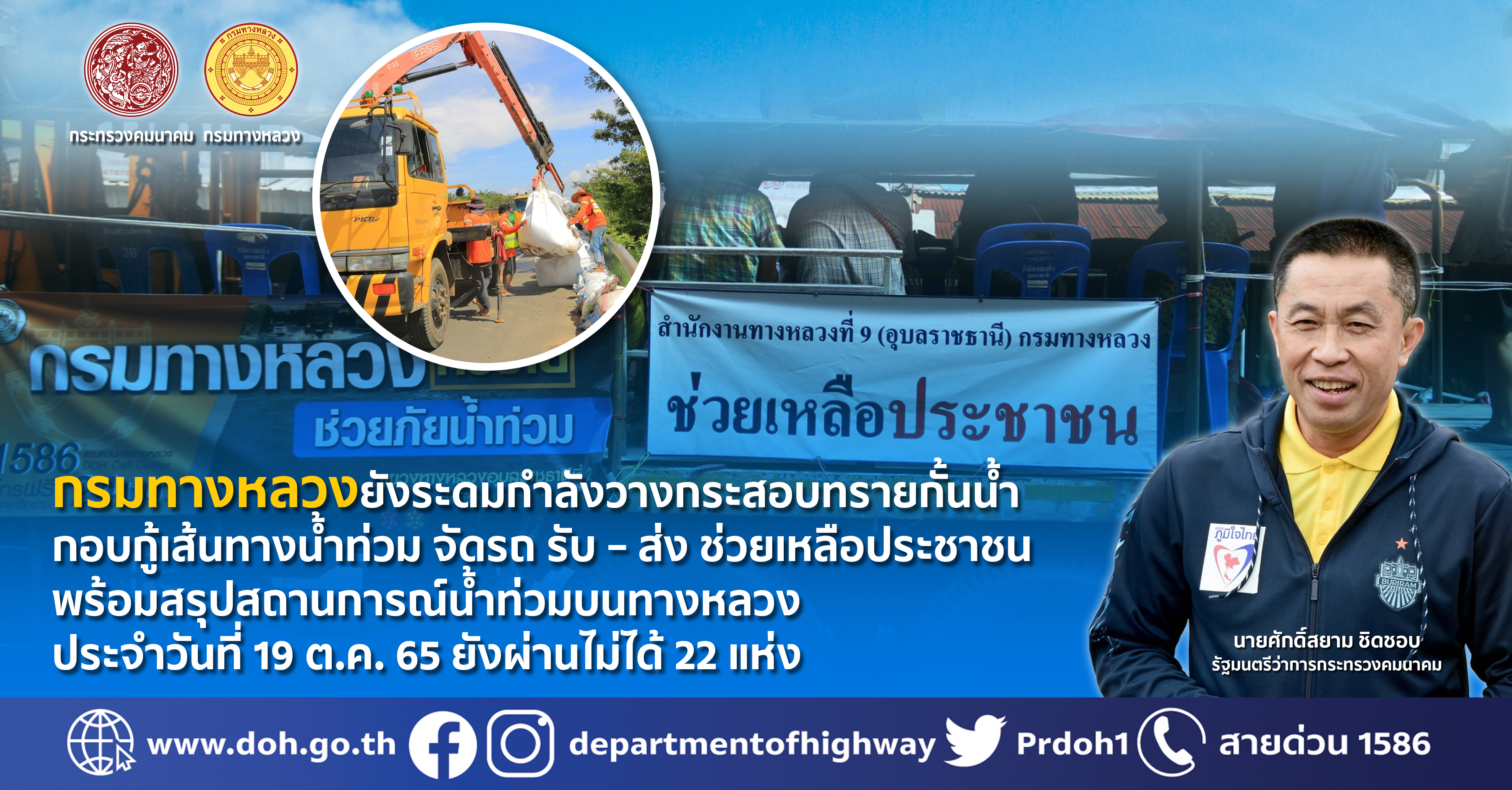 กรมทางหลวงยังระดมกำลังวางกระสอบทรายกั้นน้ำกอบกู้เส้นทางน้ำท่วม จัดรถ รับ – ส่ง ช่วยเหลือประชาชน พร้อมสรุปสถานการณ์น้ำท่วมบนทางหลวง ประจำวันที่ 19 ต.ค. 65 ยังผ่านไม่ได้ 22 แห่ง