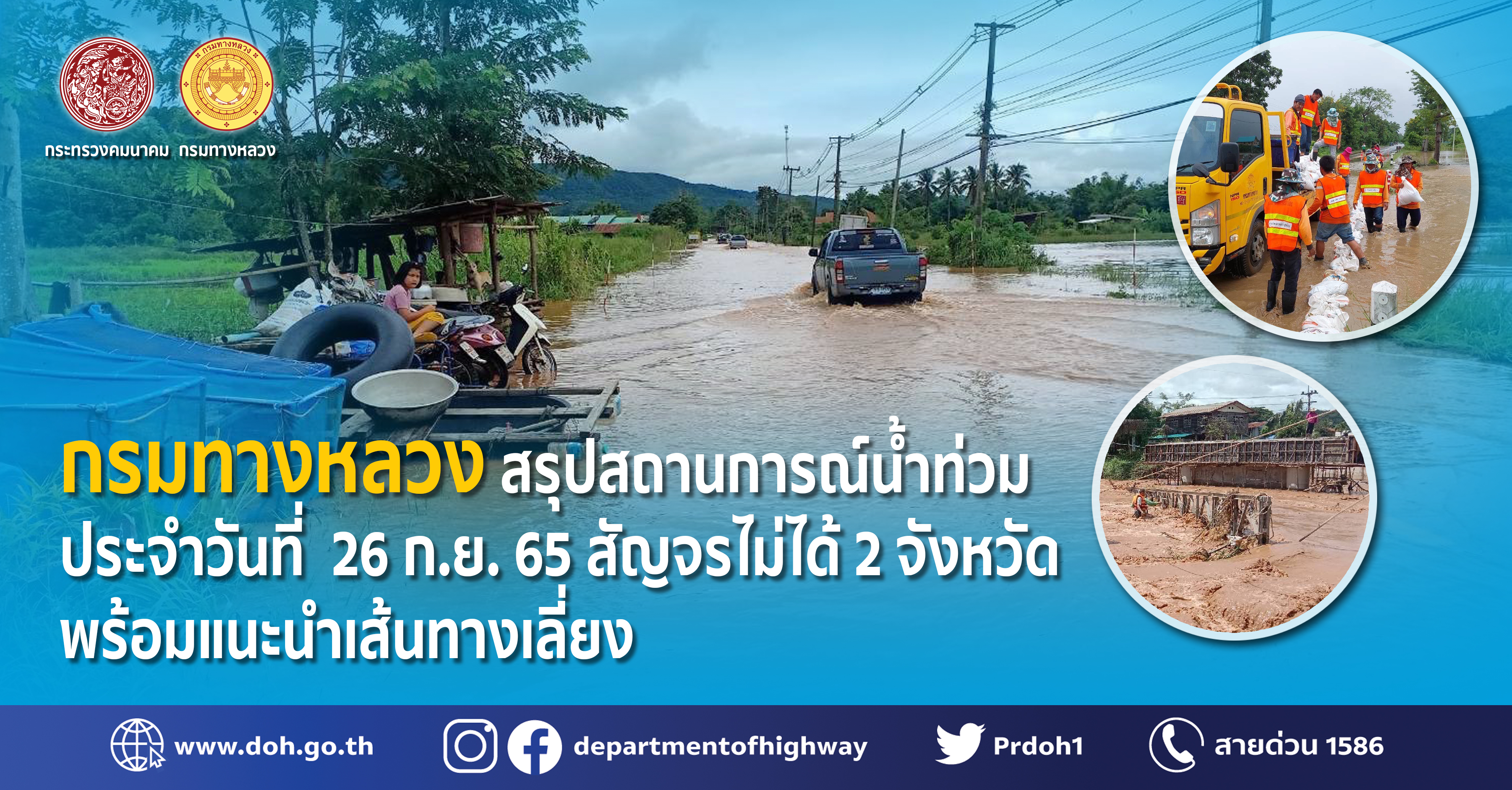 กรมทางหลวง สรุปสถานการณ์น้ำท่วมประจำวันที่ 26 ก.ย. 65 สัญจรไม่ได้ 2 จังหวัด พร้อมแนะนำเส้นทางเลี่ยง