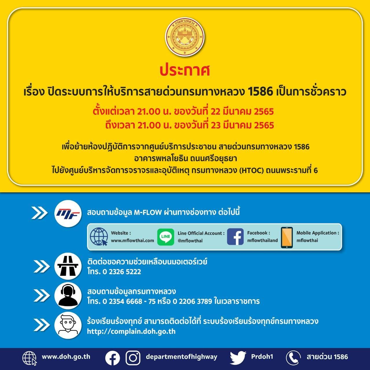 กรมทางหลวงแจ้งปิดให้บริการสายด่วน 1586 ชั่วคราว ตั้งแต่เวลา 21.00 น. ของวันที่ 22 มีนาคม 2565 ถึงเวลา 21.00 น. ของวันที่ 23 มีนาคม 2565 โดยสามารถสอบถาม ร้องเรียนปัญหา หรือขอความช่วยเหลือผ่านช่องทางหมายเลขโทรศัพท์สำนักงาน, Facebook และ Application Line