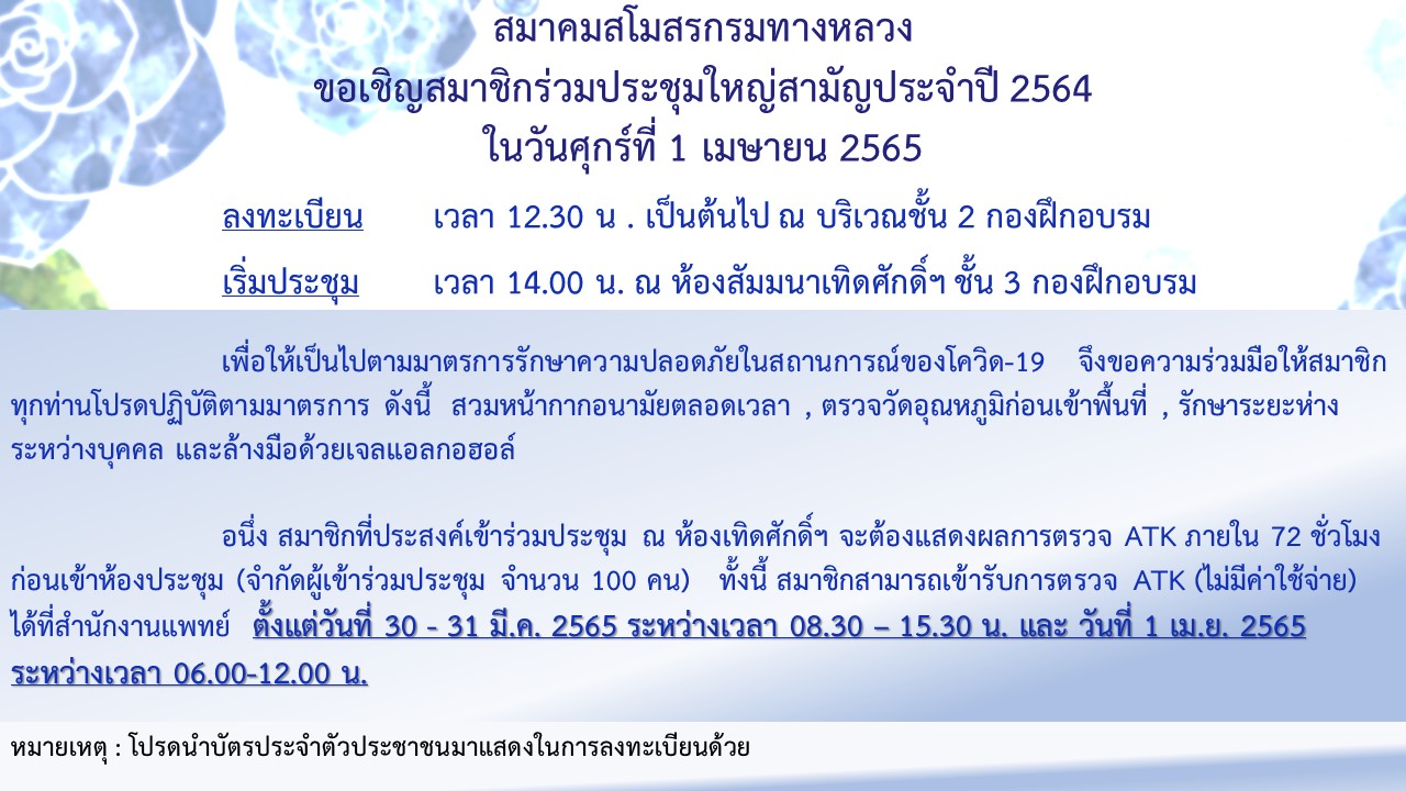 สมาคมสโมสรกรมทางหลวง ขอเชิญสมาชิกร่วมประชุมใหญ่สามัญประจำปี 2564 ในวันศุกร์ที่ 1 เมษายน 2565