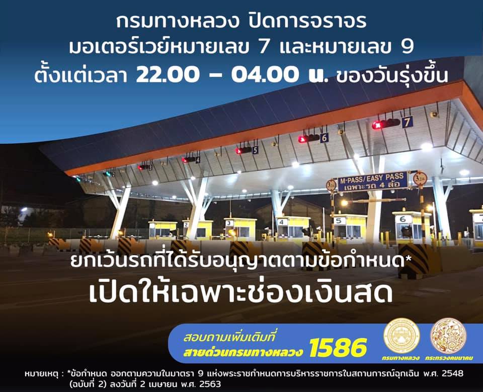 กรมทางหลวง ปิดการจราจร มอเตอร์เวย์หมายเลข 7 และหมายเลข 9 ตั้งแต่เวลา 22.00 - 04.00 น. ของวันรุ่งขึ้น