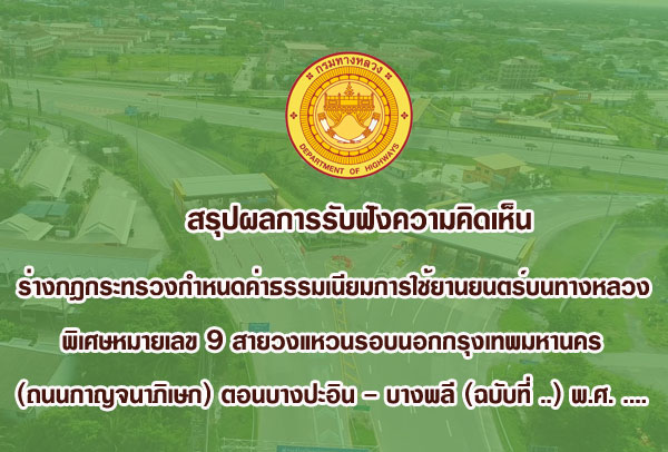 สรุปผลการรับฟังความคิดเห็น ร่างกฎกระทรวงกำหนดค่าธรรมเนียมการใช้ยานยนตร์บนทางหลวงพิเศษหมายเลข 9 สายวงแหวนรอบนอกกรุงเทพมหานคร (ถนนกาญจนาภิเษก) ตอนบางปะอิน - บางพลี (ฉบับที่ ..) พ.ศ. ....