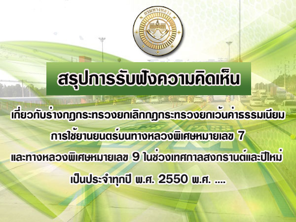 สรุปผลการรับฟังความคิดเห็น ร่างกฎกระทรวงยกเลิกกฎกระทรวงยกเว้นค่าธรรมเนียมการใช้ยานยนตร์บนทางหลวงพิเศษ หมายเลข 7 และทางหลวงพิเศษหมายเลข 9 ในช่วงเทศกาลสงกรานต์และปีใหม่ เป็นประจำทุกปี พ.ศ. 2550 พ.ศ. ....