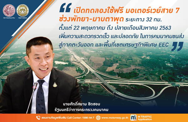 กรมทางหลวงเปิดทดลองใช้ฟรี มอเตอร์เวย์สาย7 ช่วงพัทยา - มาบตาพุด ระยะทาง 32 กม.ตั้งแต่ 22 พฤษภาคม ถึง ปลายเดือนสิงหาคม 2563