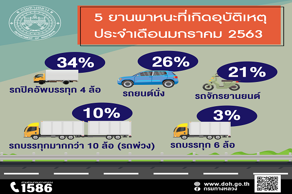 อุบัติเหตุลดลง! กรมทางหลวง สรุปอุบัติเหตุบนทางหลวงเดือนมกราคม 2563 พร้อมขอความร่วมมือปฏิบัติตามกฎจราจร พบอุบัติเหตุโทร 1586