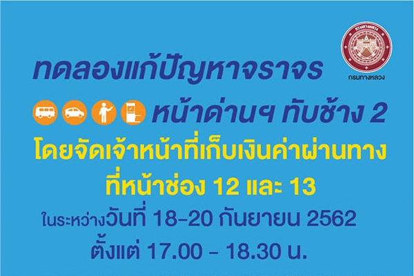 กรมทางหลวง ทดลองแก้ไขปัญหาจราจรที่ด่านฯ ทับช้าง2 มุ่งหน้าเสรีไทยและบางปะอินตั้งแต่วันที่ 18–20 ก.ย.นี้ เพื่ออำนวยความสะดวกรวดเร็วในการชำระค่าผ่านทาง