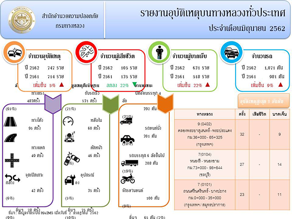 กรมทางหลวง สรุปอุบัติเหตุบนทางหลวงเดือนมิถุนายน 62 พบผู้เสียชีวิตลดลง 22% พร้อมขอความร่วมมือใช้ความเร็วตามกฎหมายกำหนด เพื่อความปลอดภัยในการเดินทาง