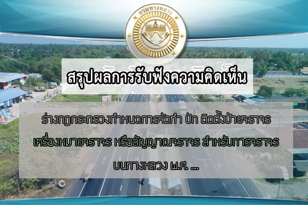 สรุปผลการรับฟังความคิดเห็นต่อร่างกฎกระทรวงกำหนดการจัดทำ ปัก ติดตั้งป้ายจราจร เครื่องหมายจราจร หรือสัญญาณจราจร สำหรับการจราจรบนทางหลวง พ.ศ. ....