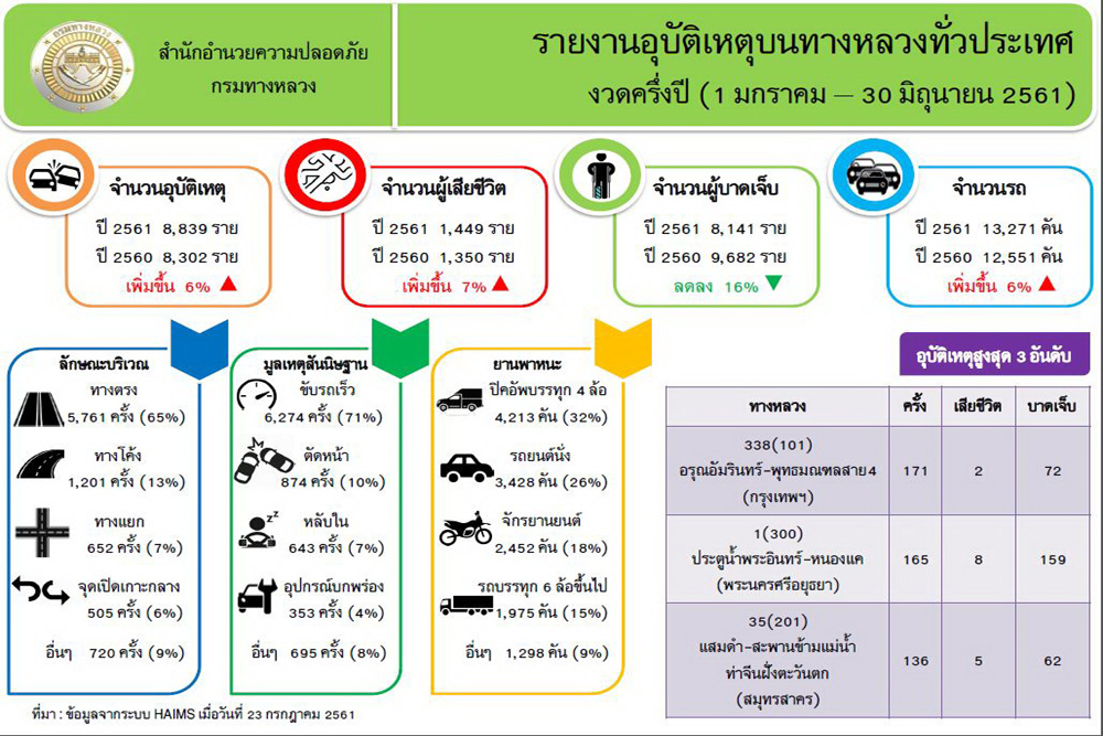 กรมทางหลวง สรุปอุบัติเหตุบนทางหลวง 6 เดือนแรกของปี 2561 อุบัติเหตุเพิ่มขึ้น 6% ทางตรงเกิดเหตุสูงสุด