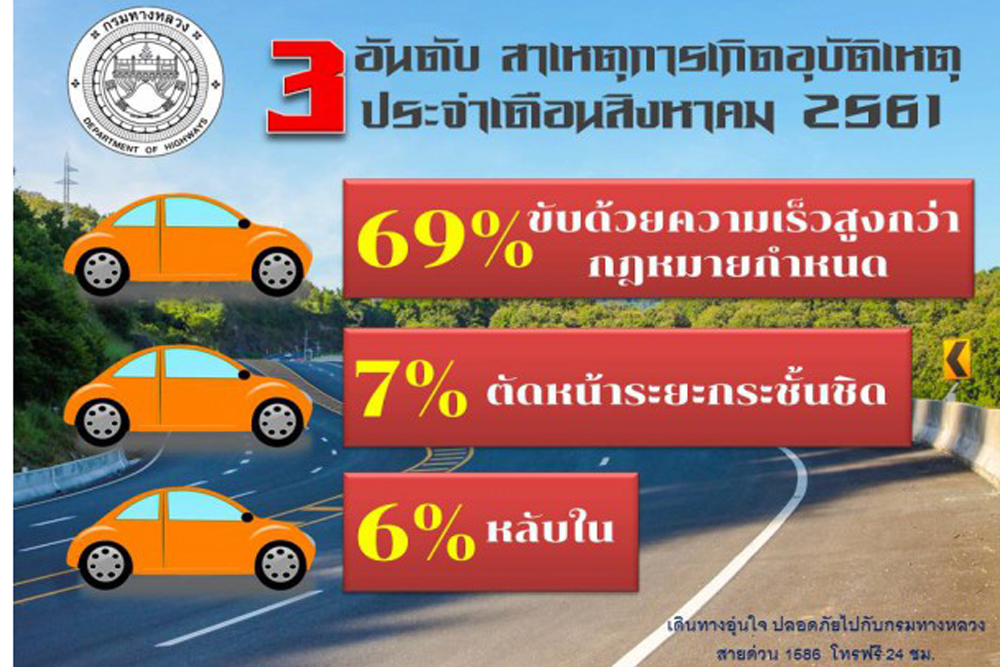กรมทางหลวง สรุปอุบัติเหตุบนทางหลวงประจำเดือนสิงหาคม 2561 พบผู้เสียชีวิตลดลง 10% จากปีที่ผ่านมา