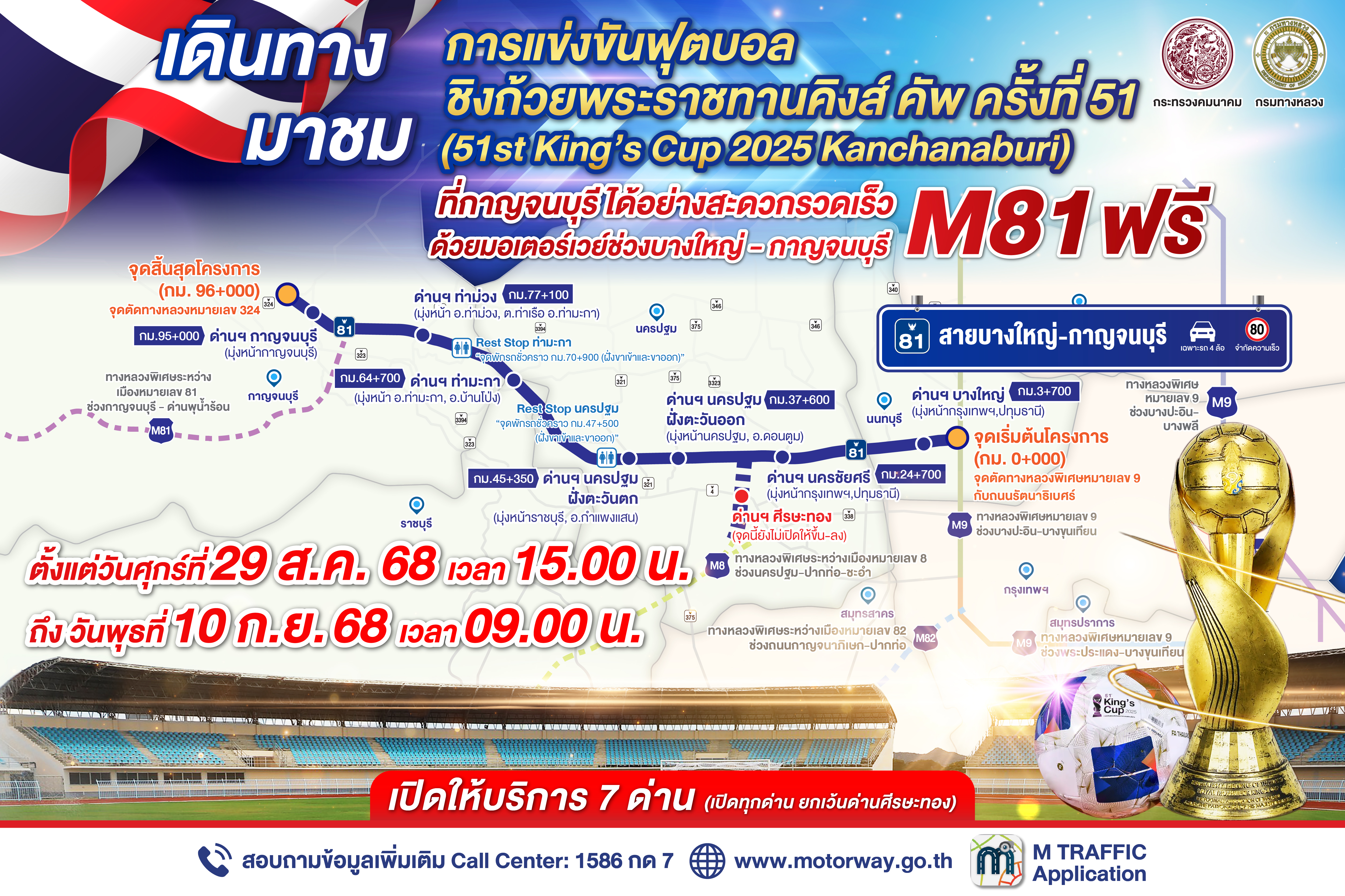กรมทางหลวงเปิดทดลองให้บริการมอเตอร์เวย์ M81 ต่อเนื่อง 13 วัน ตั้งแต่วันที่ 29 ส.ค. – 10 ก.ย. 68 อำนวยความสะดวกการเดินทางเข้าชม ‘คิงส์คัพ ครั้งที่ 51’