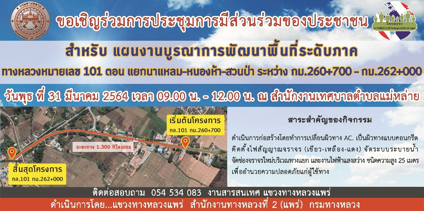 แขวงทางหลวงแพร่ ประชาสัมพันธ์โครงการประชาชนมีส่วนร่วม ทล.101 ตอน แยกนาแหลม-หนองห้า-สวนป่า