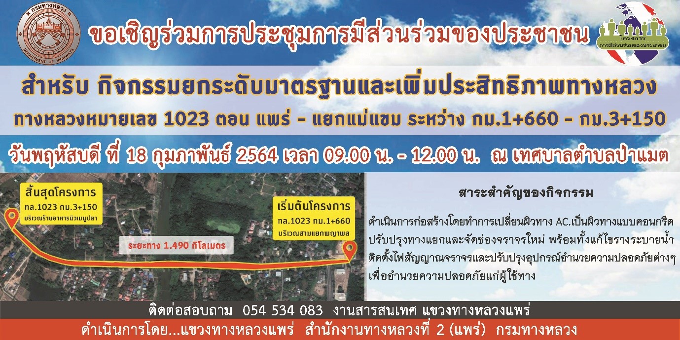 แขวงทางหลวงแพร่ ประชาสัมพันธ์โครงการประชาชนมีส่วนร่วม ทล.1023 ตอน แพร่ – แยกแม่แขม