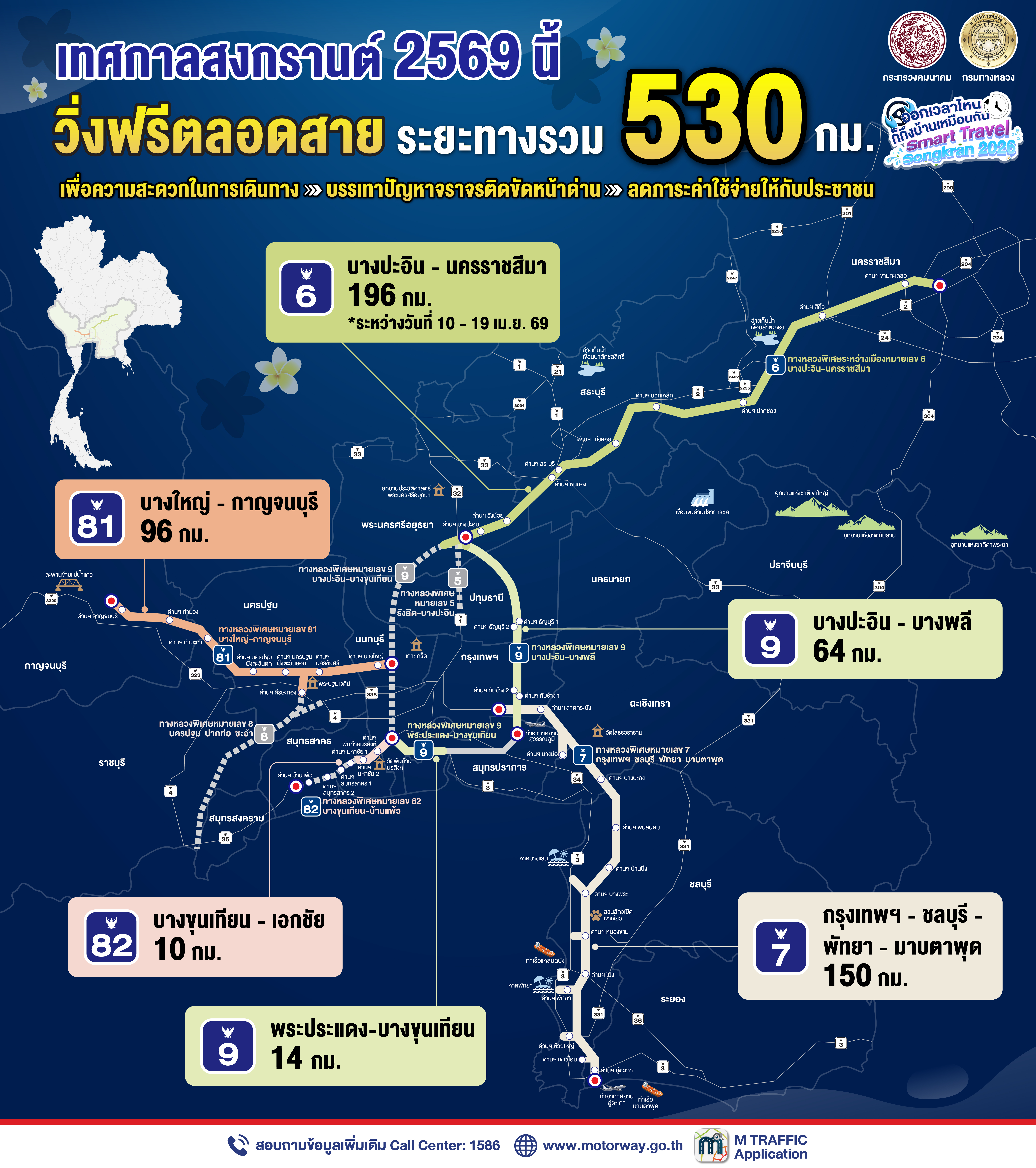 กรมทางหลวงมอบของขวัญสงกรานต์ วิ่งฟรีมอเตอร์เวย์ 5 สาย (M7-M9-M81-M6-M82) 7 วัน รวมระยะทาง 530 กม. เริ่ม10 เม.ย. นี้