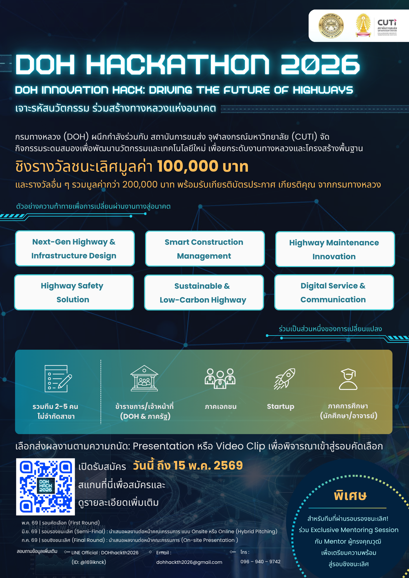 พลิกโฉมทางหลวงไทยด้วยไอเดียของคุณ! กรมทางหลวง (DOH) ผนึกกำลัง สถาบันการขนส่ง จุฬาฯ (CUTI) ขอเชิญผู้สนใจร่วมแข่งขัน DOH HACKATHON 2026: Driving the Future of Highways