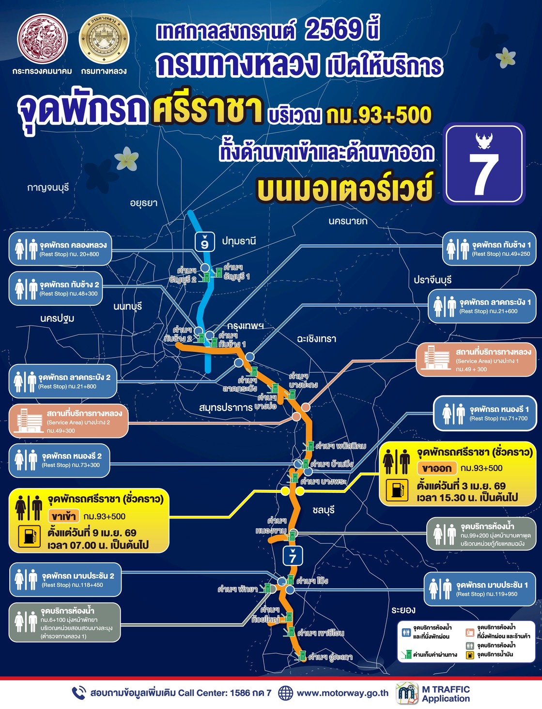 สงกรานต์นี้... แวะพักได้ตลอดทาง! กรมทางหลวงพร้อมให้บริการ 15 จุดพักรถมอเตอร์เวย์ M7 - M9 เปิดใหม่ “จุดพักรถศรีราชา” เพิ่มความสะดวกและปลอดภัยในการเดินทาง