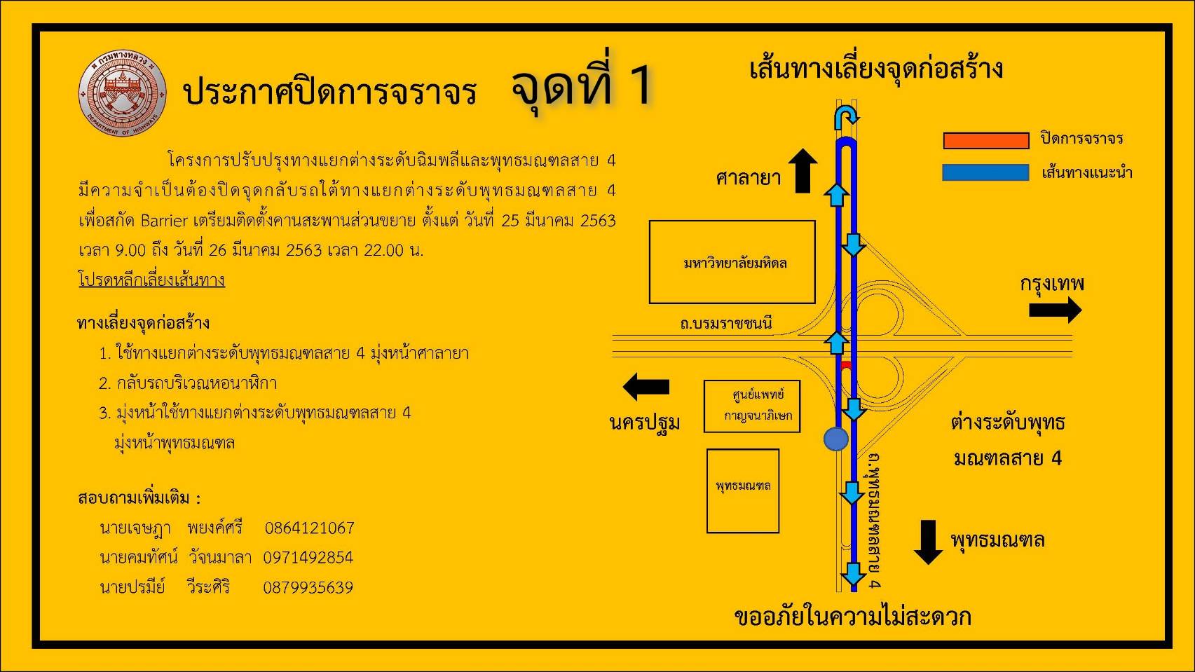 1. บริเวณจุดกลับรถใต้ทางแยกต่างระดับพุทธมณฑลสาย 4 ตั้งแต่ เวลา 09.00 น. ของวันที่ 25 - 26 มีนาคม 2563 เวลา 22.00 น. ผู้ใช้เส้นทางที่มาจากพุทธมณฑลจะเดินทางไปถนนพุทธมณฑลสาย 4 ให้ใช้สะพานต่างระดับพุทธมณฑลมุ่งหน้าศาลายา เมื่อลงสะพานต่างระดับแล้วกลับรถหน้าหอนาฬิกาแล้วตรงไปถนนพุทธมณฑลสาย 4