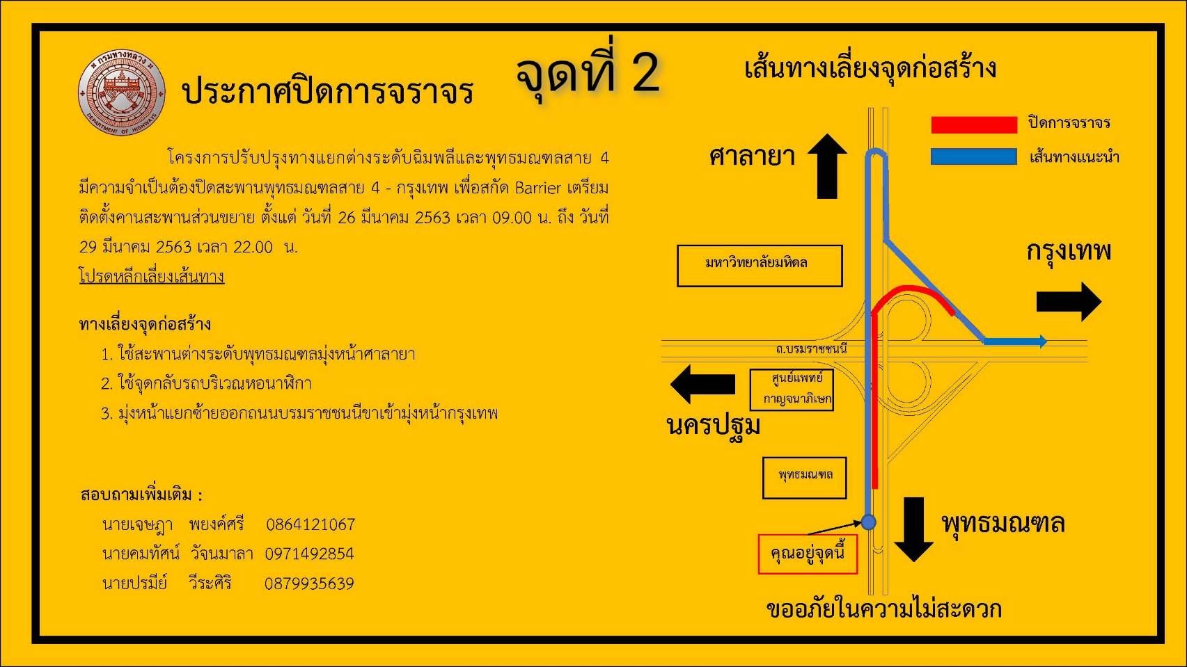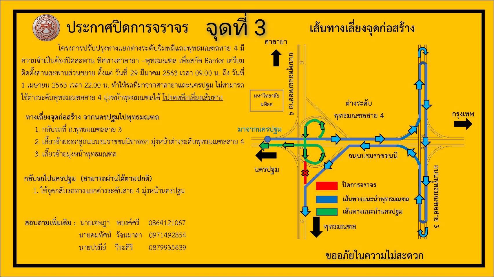 3. บริเวณสะพานศาลายา - พุทธมณฑล ในวันที่ 29 มีนาคม 2563 เวลา 9.00 น. ถึงวันที่ 1 เมษายน 2563 เวลา 22.00 น. ผู้ใช้เส้นทางที่มาจากศาลายา และจังหวัดนครปฐม จะเดินทางไปถนนพุทธมณฑล ให้ใช้ถนนบรมราชชนนี ฝั่งขาเข้า แล้วไปกลับรถที่ถนนพุทธมณฑลสาย 3 แล้ว เลี้ยวซ้ายออกสู่ถนนบรมราชชนนี ฝั่งขาออก มุ่งหน้าสะพานต่างระดับพุทธมณฑลสาย 4 แล้วเลี้ยวซ้ายมุ่งหน้าไปถนนพุทธมณฑล
