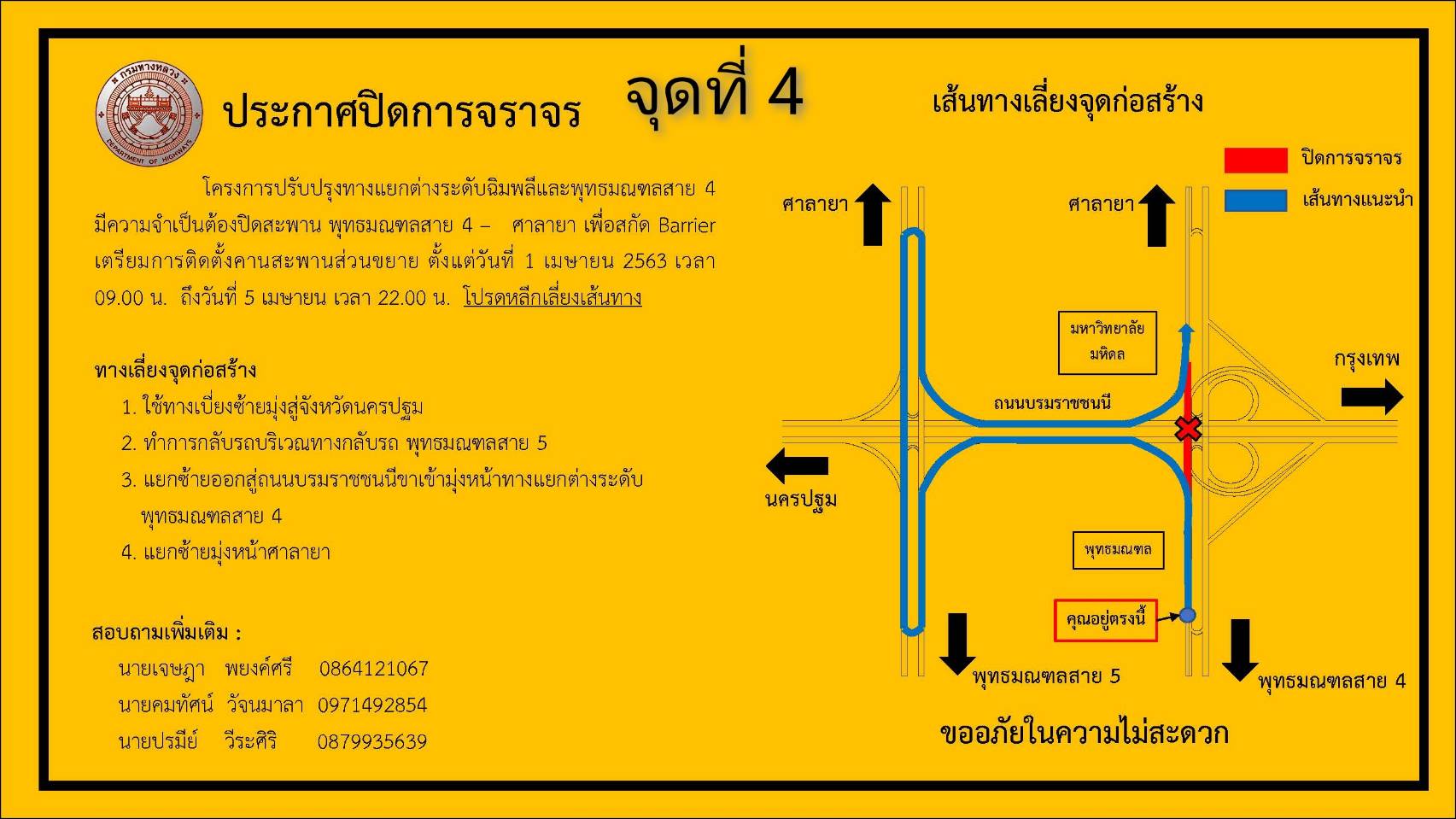 4. บริเวณสะพานพุทธมณฑลสาย 4 - ศาลายา ตั้งแต่วันที่ 1 เมษายน 2563 เวลา 9.00 น. ถึงวันที่ 5 เมษายน 2563 เวลา 22.00 น. ผู้ใช้เส้นทางที่มาจากถนนพุทธมณฑลจะเดินทางไปศาลายา ให้เบี่ยงซ้ายมุ่งสู่จังหวัดนครปฐมแล้วกลับรถบริเวณทางหลับรถถนนพุทธมณฑลสาย 5 แยกซ้ายออกสู่ถนนบรมราชชนนี ฝั่งขาเข้า มุ่งหน้าทางแยกต่างระดับพุทธมณฑลสาย 4 แยกซ้ายมุ่งหน้าศาลายา