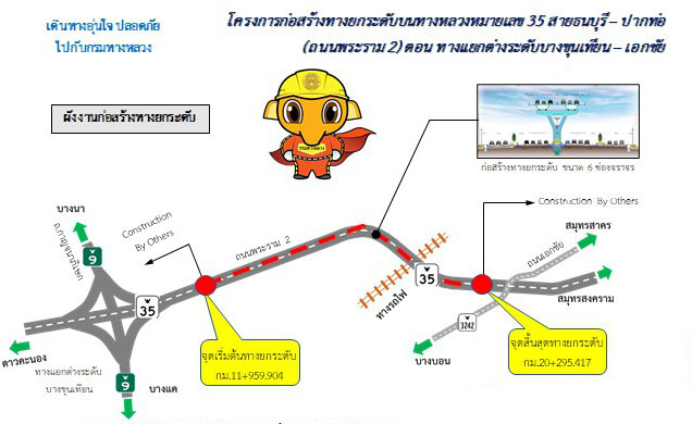 กรมทางหลวง โดย สำนักก่อสร้างสะพาน จะเริ่มดำเนินการโครงการก่อสร้างทางยกระดับบนทางหลวงหมายเลข 35 สายธนบุรี –ปากท่อ (ถนนพระราม 2) ตอน ทางแยกต่างระดับบางขุนเทียน – เอกชัย โดยก่อสร้างทางยกระดับ ขนาด 6 ช่องจราจร (ไป - กลับ) ในเกาะกลางถนนทางหลวงหมายเลข 35 (ถนนพระราม 2) ช่วงตั้งแต่ทางแยกต่างระดับบางขุนเทียนถึงบริเวณถนนเอกชัย กม.11 – กม.20 ระยะทางประมาณ 8.3 กิโลเมตร ในระหว่างการก่อสร้าง จะมีการจัดการจราจรบนถนนพระราม 2 จากเดิม 14 ช่องจราจร เป็น 12 ช่องจราจร (ไป - กลับ) โดยจะเริ่มปิดพื้นที่ เพื่อดำเนินการก่อสร้างทางยกระดับตั้งแต่บัดนี้เป็นต้นไป คาดว่าโครงการจะแล้วเสร็จเดือนสิงหาคม 2565