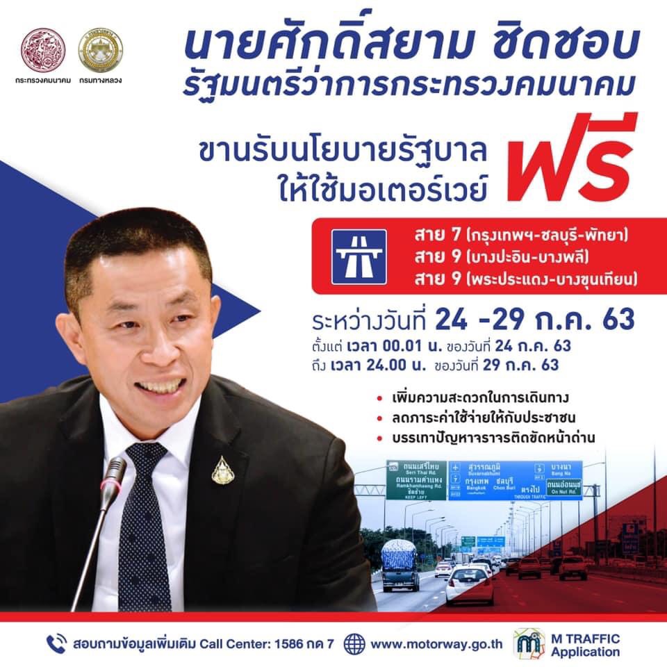 นอกจากนี้ กรมทางหลวงได้ยกเว้นค่าธรรมเนียมผ่านทางทางหลวงพิเศษ จำนวน 2 เส้นทาง ได้แก่ ทางหลวงพิเศษหมายเลข 7 กรุงเทพฯ – ชลบุรี –พัทยา ทางหลวงพิเศษหมายเลข 9 บางปะอิน - บางพลี และพระประแดง - บางขุนเทียน ตั้งแต่เวลา 00.01 น. ของวันที่ 24 กรกฎาคม 2563 ถึง เวลา 24.00 น. ของวันที่ 29 กรกฎาคม 2563 รวมระยะเวลา 6 วัน