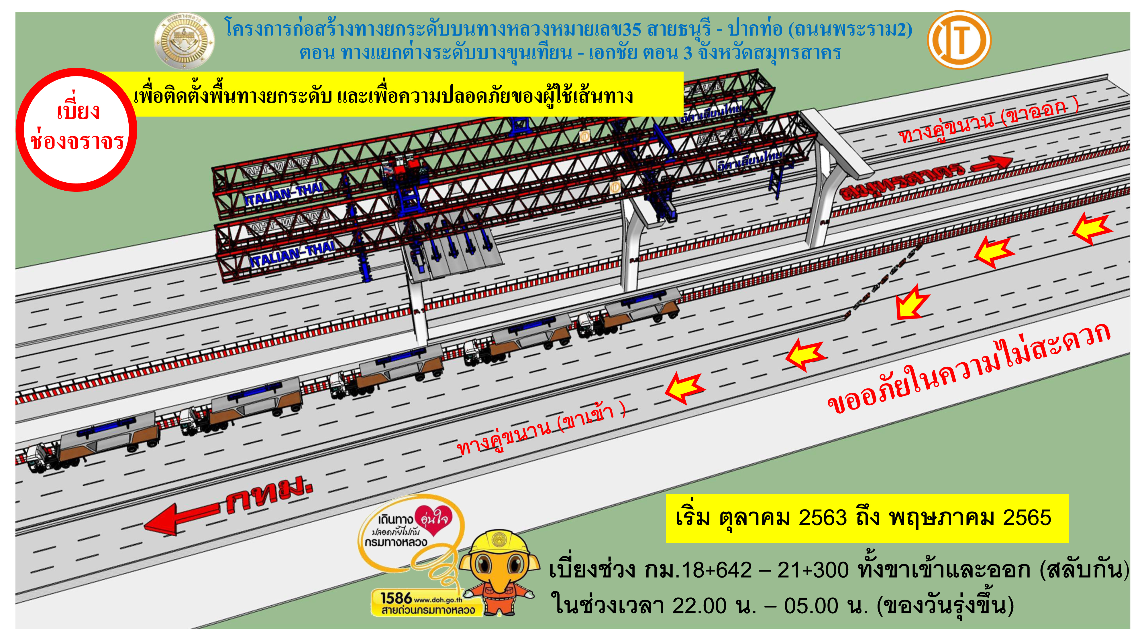 กรมทางหลวง โดย สำนักก่อสร้างสะพาน ดำเนินโครงการก่อสร้างทางยกระดับบนทางหลวงหมายเลข 35 สายธนบุรี – ปากท่อ (ถนนพระราม 2) ตอนทางแยกต่างระดับบางขุนเทียน – เอกชัย ตอน 3 จังหวัดสมุทรสาคร โดยจะทำการติดตั้งพื้นทางยกระดับ ที่บริเวณ กม.18 - 21 ทั้งขาเข้าและขาออก (สลับกัน) จึงมีความจำเป็นต้องเบี่ยงการจราจรช่องทางหลักฝั่งขาเข้าและขาออก (สลับกัน) ตั้งแต่บัดนี้เป็นต้นไป จนถึง พฤษภาคม 2565 ช่วงเวลา 22.00 น. – 05.00 น. ของวันรุ่งขึ้น ดังนี้