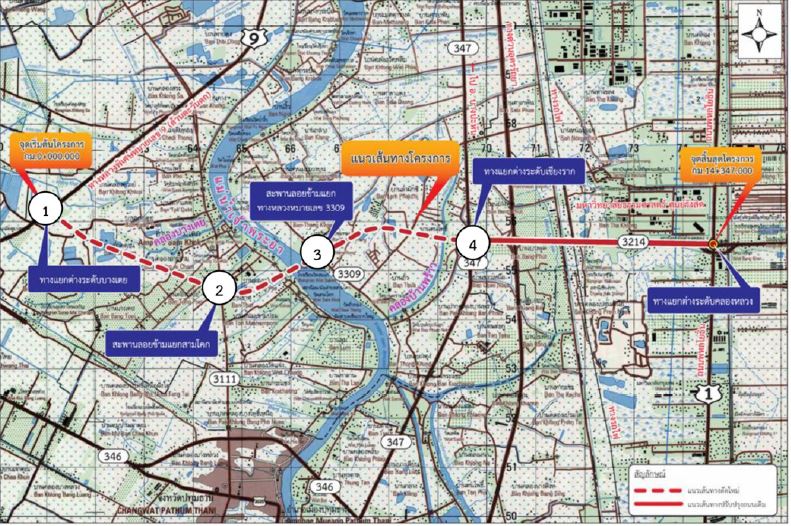 กรมทางหลวง ได้ดำเนินโครงการสำรวจและออกแบบทางหลวงแนวใหม่ ระหว่างทางหลวงพิเศษหมายเลข 9 ด้านตะวันตก-จุดตัดทางหลวงหมายเลข 347 - จุดตัดทางหลวงพิเศษหมายเลข 9 ด้านตะวันออก เพื่อแก้ไขปัญหาการจราจรและพัฒนาโครงข่ายทางหลวงเพื่อรองรับการเดินทาง ระหว่างทางหลวงพิเศษหมายเลข 9 (ด้านตะวันตก) - ทางหลวงพิเศษหมายเลข 9 (ด้านตะวันออก) ของ จ.ปทุมธานี ตลอดจนเสริมโครงข่ายทางหลวงตามแนวสายทาง ปทุมธานี-รังสิต-อ.องค์รักษ์ ช่วยบรรเทาปัญหาการจราจรหนาแน่น และเป็นเส้นทางเสริมโครงข่ายการจราจรบริเวณ จ.ปทุมธานีให้มีโครงข่ายการเดินทางที่สมบูรณ์ โดยมีจุดเริ่มต้นโครงการที่ กม. 0+000 จุดสิ้นสุดโครงการ ที่ กม.14+347 ระยะทาง 14.347 กิโลเมตร รวมงานออกแบบปรับภูมิทัศน์บริเวณสะพานข้ามแม่น้ำเจ้าพระยา (สะพานสามโคก) และกรมทางหลวงได้ออกแบบใต้สะพานข้ามแม่น้ำเจ้าพระยาเพื่อใช้เป็นพื้นที่ควบคุมและบำรุงรักษาทางหลวง และอีกส่วนหนึ่งให้ชุมชนได้ใช้ประโยชน์ เช่น ลานกีฬา สวนพักผ่อน และสถานที่จัดงานตามเทศกาลต่างๆ โดยมูลค่าลงทุนของโครงการฯ รวม 9,590 ล้านบาท