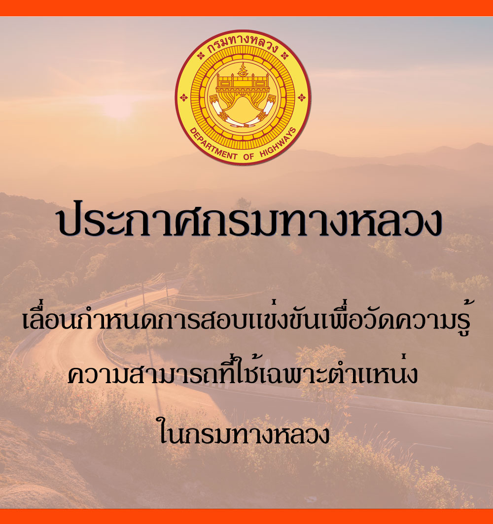 ประกาศกรมทางหลวง เรื่องเลื่อนกำหนดการสอบแข่งขันเพื่อวัดความรู้ความสามารถเฉพาะตำแหน่่ง ในวันที่ 25 เมษายน 2564