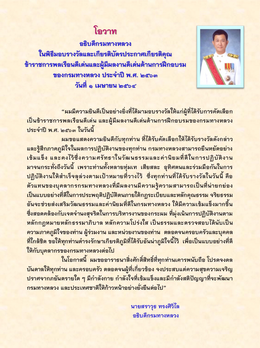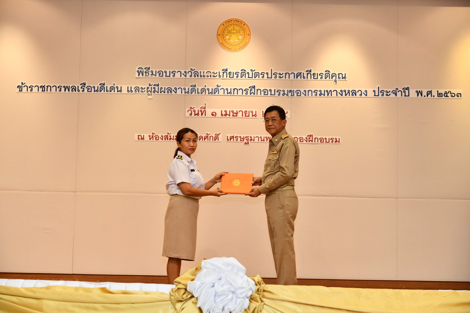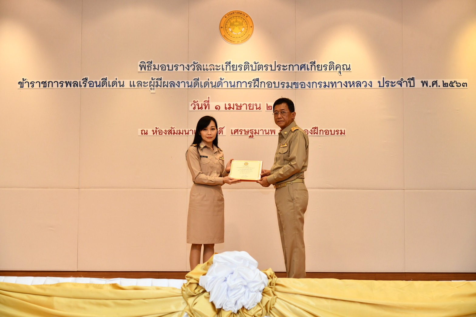 นายสราวุธ ทรงศิวิไล อธิบดีกรมทางหลวง เป็นประธานและมอบรางวัลแก่ผู้ที่ได้รับการคัดเลือกเป็นข้าราชการพลเรือนดีเด่นและผู้มีผลงานดีเด่นด้านการฝึกอบรมของกรมทางหลวง ประจำปี พ.ศ. 2563 ณ ห้องสัมมนาเทิดศักดิ์ เศรษฐมานพ กองฝึกอบรม เมื่อวันที่ 1 เม.ย. 64 ที่ผ่านมา