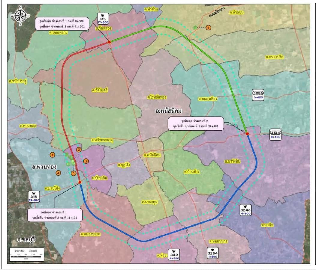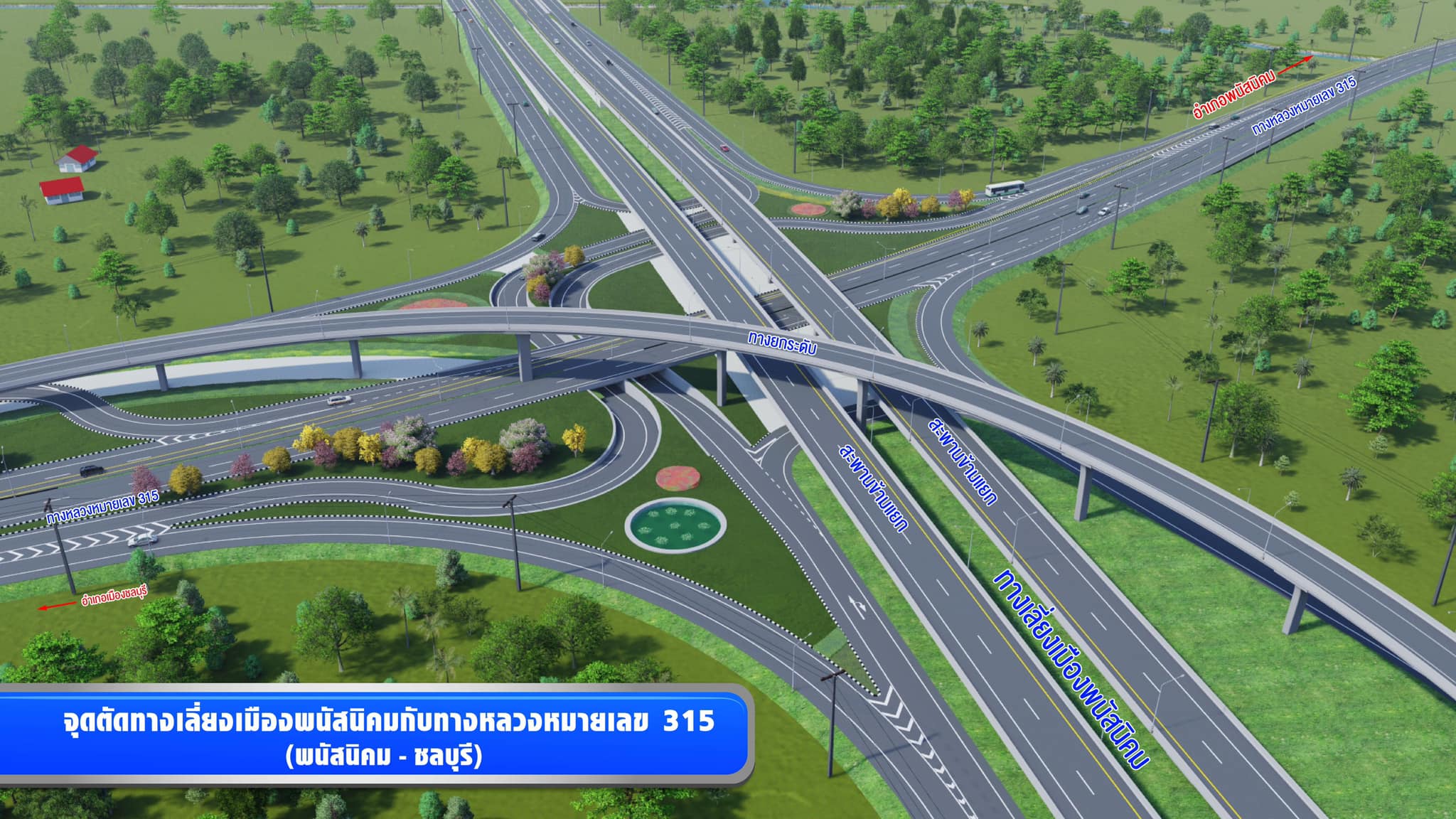 กรมทางหลวง ได้ดำเนินโครงการสำรวจและออกแบบทางหลวง 4 ช่องจราจร ทางเลี่ยงเมืองพนัสนิคม จังหวัดชลบุรี เพื่อใช้เป็นเส้นทางในการขนส่งสินค้าจากนิคมอุตสาหกรรมในพื้นที่ภาคตะวันออก ซึ่งเป็นแหล่งผลิตที่สำคัญกับประตูการค้าระหว่างประเทศ ได้แก่ท่าเรือน้ำลึกแหลมฉบังและมาบตาพุด และช่วยแยกการจราจรผ่านเมืองพนัสนิคมออกจากการจราจรท้องถิ่นภายในอำเภอพนัสนิคม เพื่อแก้ปัญหาการจราจรที่หนาแน่นและติดขัด เพิ่มความปลอดภัยในการสัญจรและพัฒนาคุณภาพการให้บริการของระบบทางหลวง โดยมีจุดเริ่มต้นโครงการที่ทางหลวงหมายเลข 315 (ฉะเชิงเทรา-พนัสนิคม) ที่ กม.17+500 ตัดผ่านถนนบ้านกลางเลียบด้านตะวันตกของหมู่บ้านเอื้ออาทร ตัดกับทางหลวงแผ่นดินหมายเลข 315 (พนัสนิคม-ชลบุรี) ที่ กม.29+800 มุ่งไปทางด้านใต้ ทิศทางทวนเข็มนาฬิกา ตัดผ่านทางหลวงหมายเลข 349 ที่ กม.4+300 มุ่งทางด้านตะวันออก ตัดผ่านทางหลวงหมายเลข 3284 ที่ กม.1+800 แล้วมุ่งทางด้านตะวันออกตัดผ่านทางหลวงหมายเลข 3246 ที่ กม.4+900 และมุ่งหน้าทางทิศเหนือผ่านทางหลวงชนบทสาย ชบ.3104 ที่ กม.8+400 ตัดผ่านทางหลวงชนบทสาย ชบ.3086 ที่ กม.1+400 ตัดผ่านถนนเมืองเก่าอ้อมด้านเหนือของโครงการอนุรักษ์พื้นฟูแหล่งน้ำไร่หลักทอง บรรจบที่จุดตัดทางหลวงหมายเลข 315 (ฉะเชิงเทรา-พนัสนิคม)