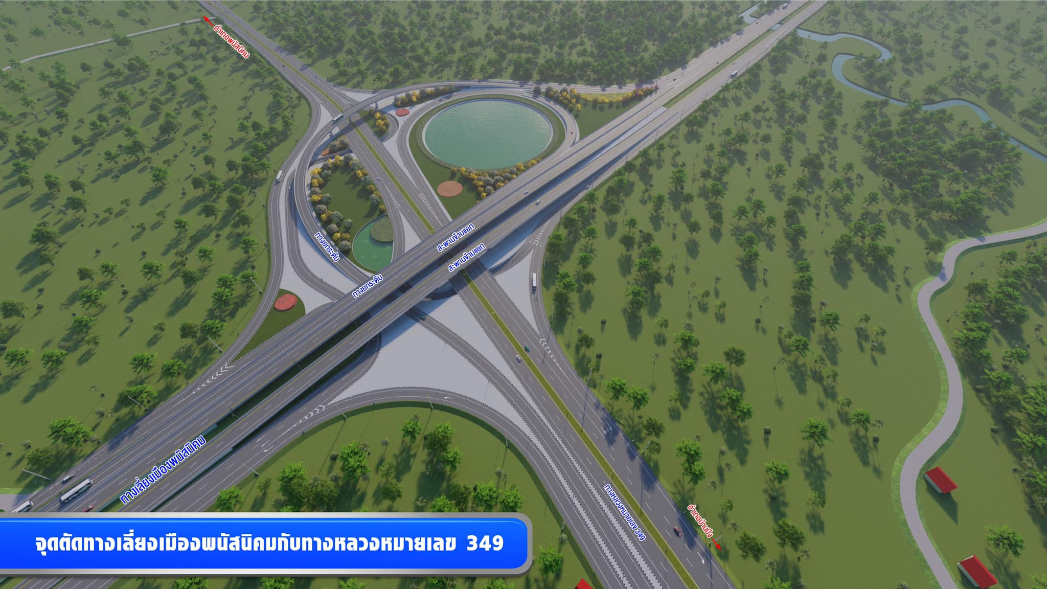 4) จุดตัดทางหลวงหมายเลข 349 ออกแบบเป็นทางแยกต่างระดับ โดยมีสะพานข้ามแยกบนถนนโครงการข้ามทางหลวงหมายเลข 349 มีทางยกระดับเลี้ยวขวาจากด้านตะวันตกของถนนโครงการ ไปด้านใต้ของทางหลวงหมายเลข 349 มีทางยกระดับเลี้ยวขวาจากด้านใต้ของทางหลวงหมายเลข 349 ไปด้านตะวันออกของถนนโครงการ และมีจุดกลับรถใต้สะพาน