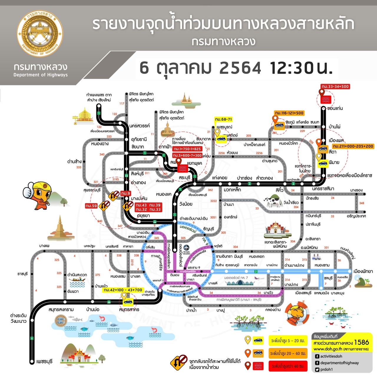กรมทางหลวง ได้ทำการสรุปสถานการณ์อุทกภัยและดินสไลด์บนทางหลวง สถานการณ์ประจำวันที่ 6 ตุลาคม 2564 เวลา 12.30 น. พบทางหลวงถูกน้ำท่วม/ดินสไลด์ในพื้นที่ 15 จังหวัด ได้แก่ จ.ชัยภูมิ, จ.ขอนแก่น, จ.นครราชสีมา, จ.นนทบุรี, จ.สระบุรี, จ.อ่างทอง, จ.สุโขทัย, จ.ลพบุรี, จ.กำแพงเพชร, จ.พระนครศรีอยุธยา, จ.สุพรรณบุรี, จ.นครสวรรค์, จ.สมุทรสาคร, จ.กาญจนบุรี จำนวน 30 สายทาง 54 แห่ง ทางหลวงที่การจราจรผ่านได้ 35 แห่ง การจราจรผ่านไม่ได้ 19 แห่ง
