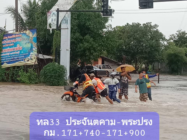 - ทล. 33 ประจันตคาม – พระปรง ช่วง กม.ที่ 171+400-กม.171+900 ระดับน้ำสูง 15-50 ซม.