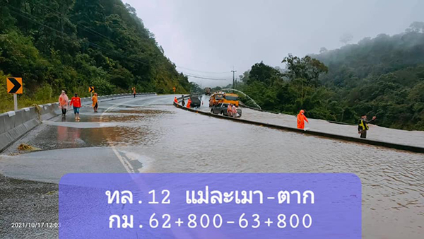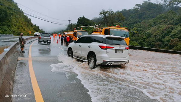 สำหรับสถานการณ์ประจำวันที่ 17 ตุลาคม 2564 เวลา 13.30 น. พบทางหลวงถูกน้ำท่วม/ดินสไลด์ และสะพานชำรุด จำนวน 18 จังหวัด ( 59 สายทาง 100 แห่ง) โดยทางหลวงในจังหวัดที่ได้รับผลกระทบจากอุทกภัย ได้แก่ 1) จ.ขอนแก่น 2) จ.มหาสารคาม 3) จ.นครราชสีมา 4) จ.ชัยภูมิ 5) จ.ลพบุรี 6) จ.นนทบุรี 7) จ.อ่างทอง จ.พระนครศรีอยุธยา 9) จ.สุพรรณบุรี 10) จ.อุทัยธานี 11) จ.เพชรบูรณ์ 12) จ.กรุงเทพมหานคร 13) จ.สมุทรปราการ 14) จ.ปราจีนบุรี 15) จ.สระแก้ว 16) จ.ชลบุรี 17) จ.ตาก 18) จ.กาญจนบุรี