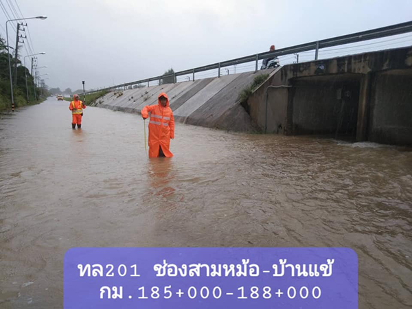 - ทล.201 ช่องสามหมอ-บ้านแข้ กม. 185+000-185+300 (จุดกลับรถใต้สะพาน) ระดับน้ำสูง 20-60 ซม.