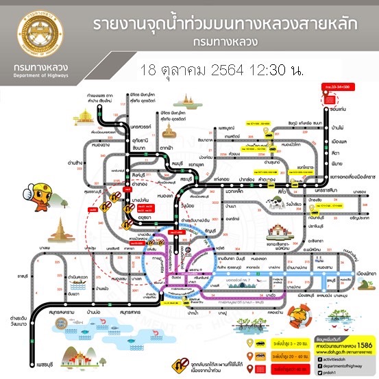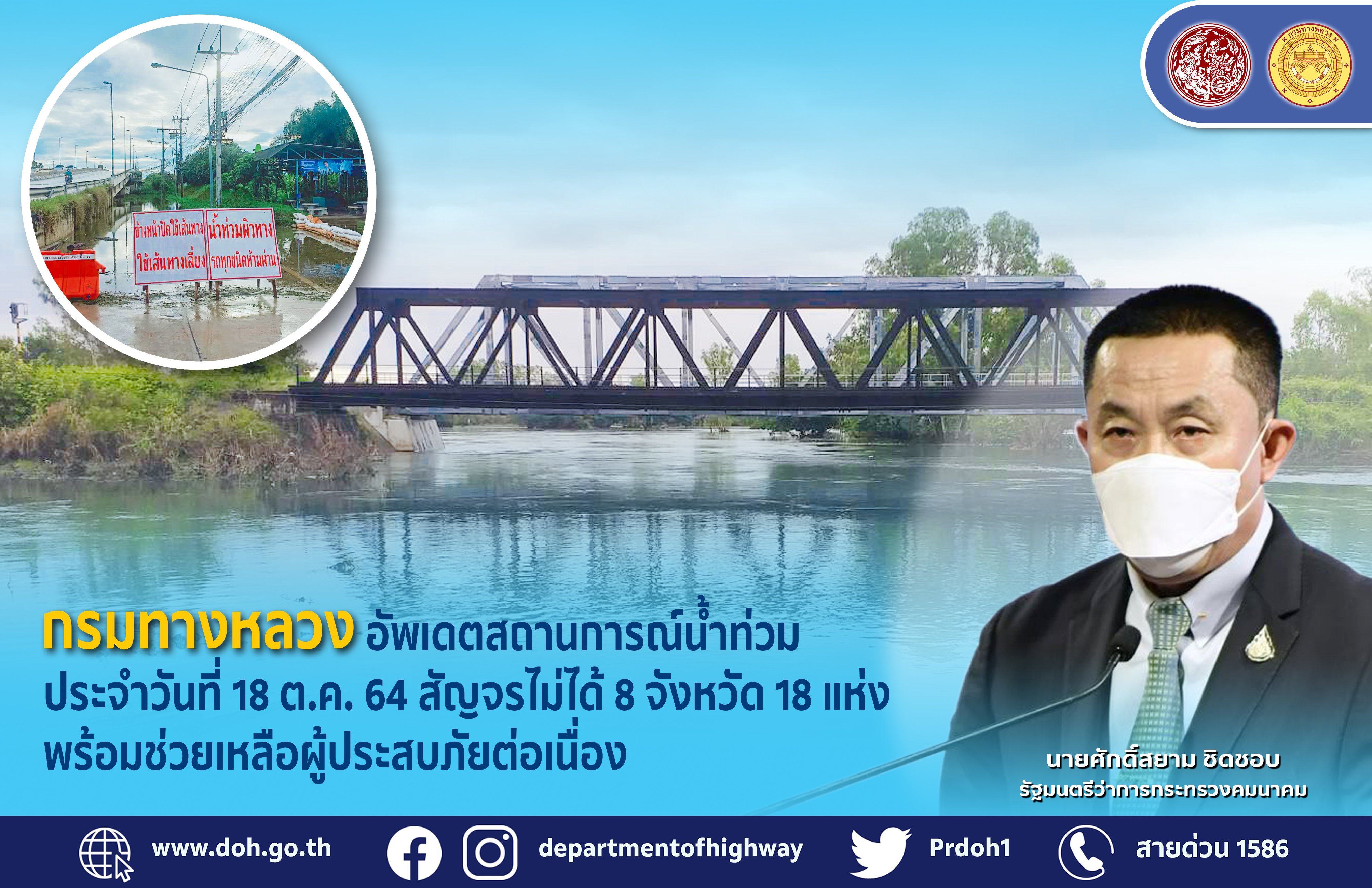 นายสราวุธ ทรงศิวิไล อธิบดีกรมทางหลวง เปิดเผยว่า ตามที่ นายศักดิ์สยาม ชิดชอบ รัฐมนตรีว่าการกระทรวงคมนาคม กำชับหน่วยงานที่เกี่ยวข้องรับมือสถานการณ์อุทกภัย โดยให้ดำเนินการตามแผนบรรเทาสาธารณภัยอย่างเคร่งครัด พร้อมวางแนวทางป้องกัน–ฟื้นฟู–เยียวยาหลังสถานการณ์คลี่คลายในทุกมิติ พร้อมทั้งเฝ้าระวังตลอด 24 ชั่วโมง เพื่อช่วยเหลือประชาชนที่ได้รับผลกระทบอย่างทันท่วงที และประชาสัมพันธ์การดำเนินการให้ประชาชนให้รับทราบมีรายละเอียด สถานการณ์ประจำวันที่ 18 ตุลาคม 2564 เวลา 12.30 น. จังหวัดที่การจราจรผ่านไม่ได้ 8 จังหวัด จำนวน 13 สายทาง 18 แห่ง รายละเอียดดังนี้