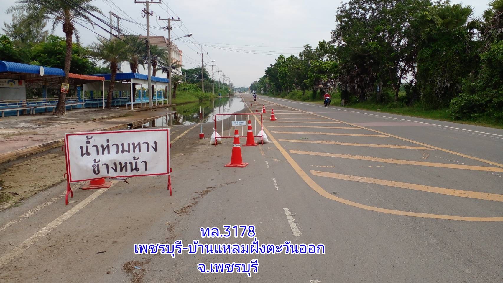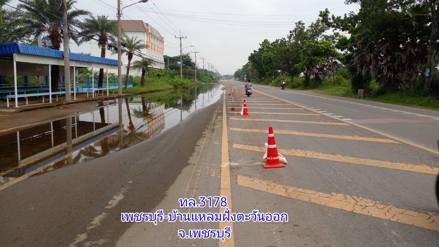 ?1. ทล.3178 ช่วง เพชรบุรี-บ้านแหลมฝั่งตะวันออก กม.10+700-10+900 ระดับน้ำสูง 10 ซม พื้นที่ อ.บ้านแหลม