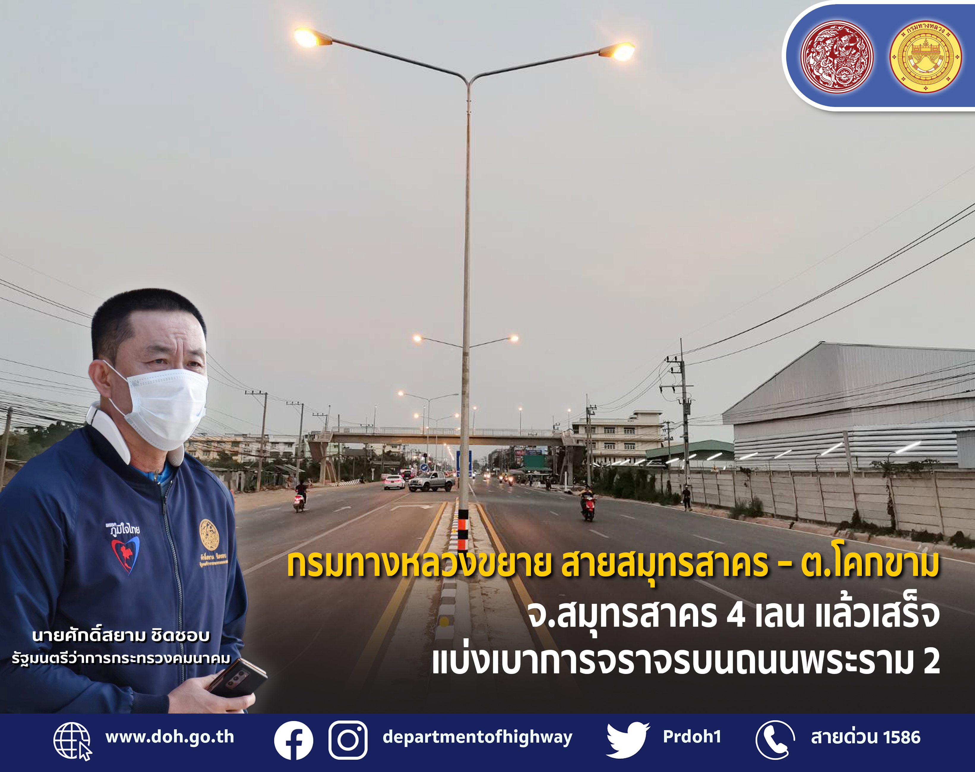 กรมทางหลวง โดย สำนักก่อสร้างทางที่ 1 ดำเนินโครงการก่อสร้างขยายทางหลวงหมายเลข 3423 สายสมุทรสาคร – ต.โคกขาม จ.สมุทรสาคร ระหว่าง กม.0 – กม.7 ระยะทางยาวประมาณ 6.93 กิโลเมตร จาก 2 ช่องจราจร เป็น 4 ช่องจราจร แล้วเสร็จ ตามนโยบายของนายศักดิ์สยาม ชิดชอบ รัฐมนตรีว่าการกระทรวงคมนาคม ที่ต้องการบูรณาการพัฒนาด้านคมนาคมและระบบโลจิสติกส์ แก้ไขปัญหาการจราจรในพื้นที่กรุงเทพมหานคร ปริมณฑลและเมืองหลัก