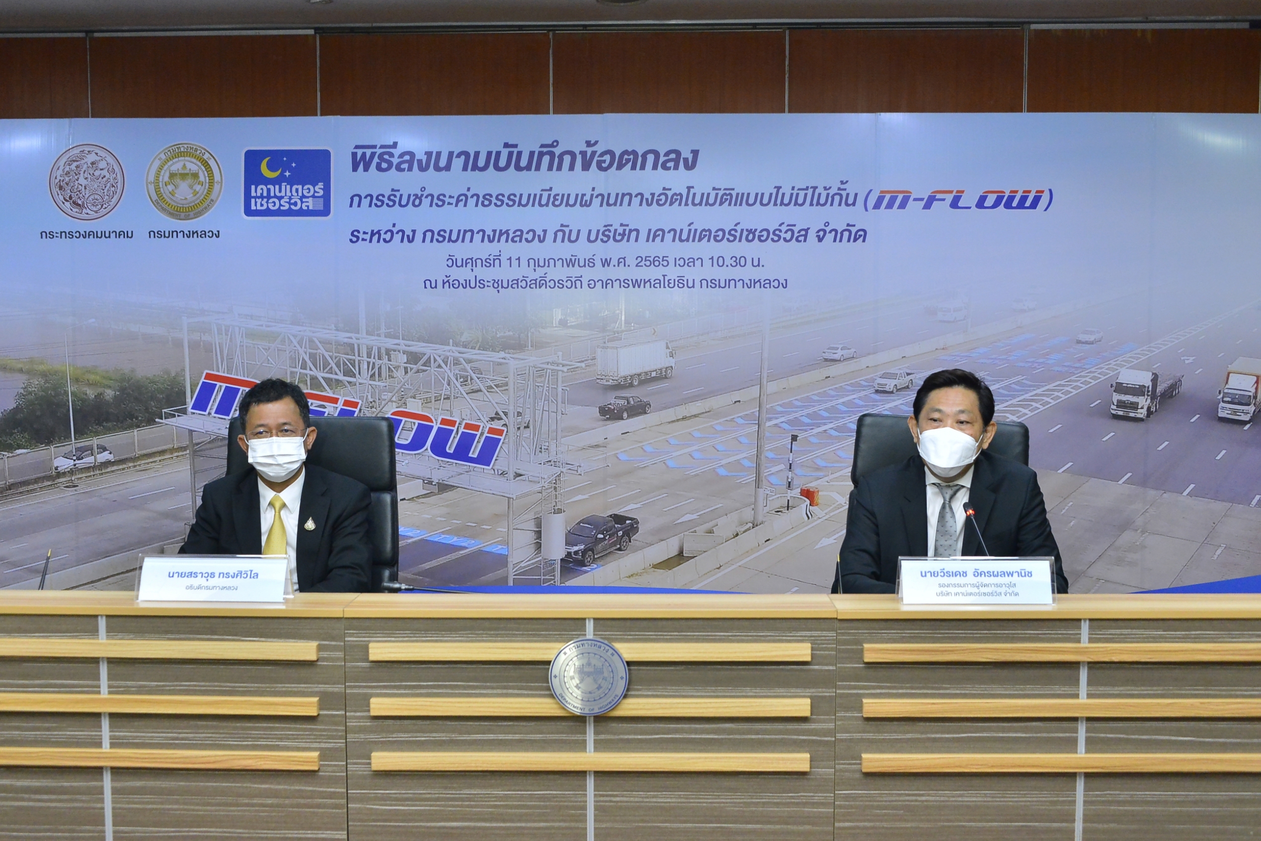 วันนี้ (11 ก.พ. 65) นายสราวุธ ทรงศิวิไล อธิบดีกรมทางหลวง และ นายวีรเดช อัครผลพานิช รองกรรมการผู้จัดการอาวุโส บริษัท เคาน์เตอร์เซอร์วิส จำกัด ร่วมลงนามบันทึกข้อตกลง การรับชำระค่าธรรมเนียมผ่านทางอัตโนมัติแบบไม่มีไม้กั้น (M-Flow) ระหว่างกรมทางหลวง กับ เคาน์เตอร์เซอร์วิส จำกัด ในวันศุกร์ที่ 11 กุมภาพันธ์ 2565 เวลา 10.30 น. ณ ห้องประชุมสวัสดิ์วรวิถี กรมทางหลวง