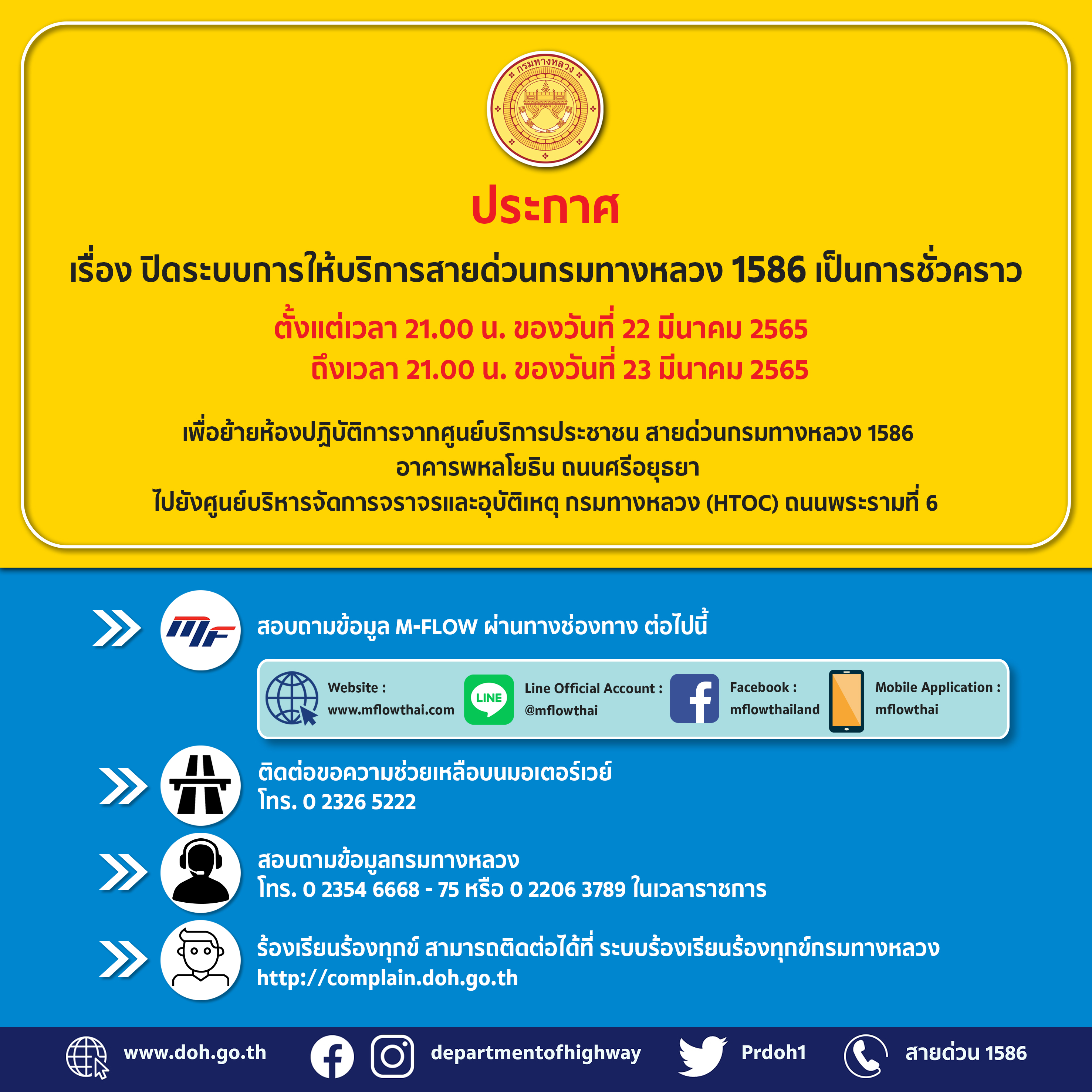 เนื่องจากกรมทางหลวงจะย้ายห้องปฏิบัติงาน Call Center 1586 จึงมีความจำเป็นต้องปิดระบบการให้บริการของสายด่วนกรมทางหลวงทั้งหมด ตามวันและเวลา ดังกล่าว