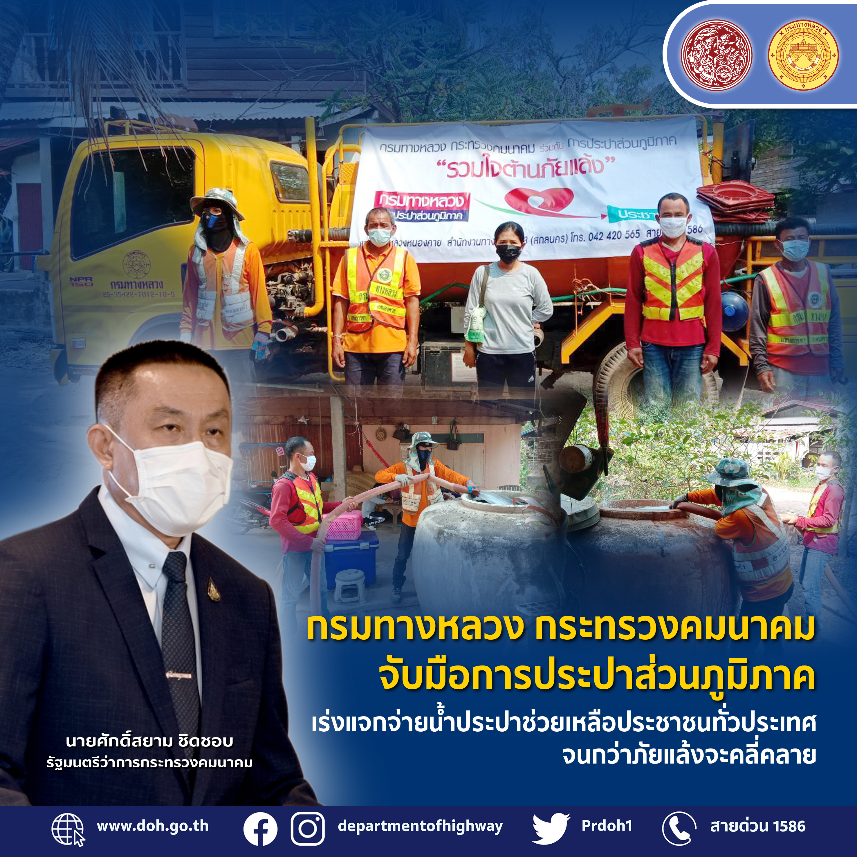 กรมทางหลวง กระทรวงคมนาคม จับมือการประปาส่วนภูมิภาคเร่งแจกจ่ายน้ำประปาช่วยเหลือประชาชนทั่วประเทศจนกว่าภัยแล้งจะคลี่คลาย