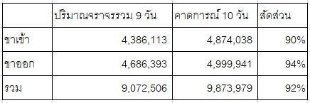 โดยช่วงที่ผ่านมาระหว่างวันที่ 8 - 16 เมษายน 2565 มีจำนวนปริมาณจราจรเข้าและออกกรุงเทพมหานคร รวมทั้งสิ้น 9,072,506 คัน โดยแบ่งเป็นฝั่งขาเข้าจำนวน 4,386,113 คัน และฝั่งขาออกจำนวน 4,686,393 คัน