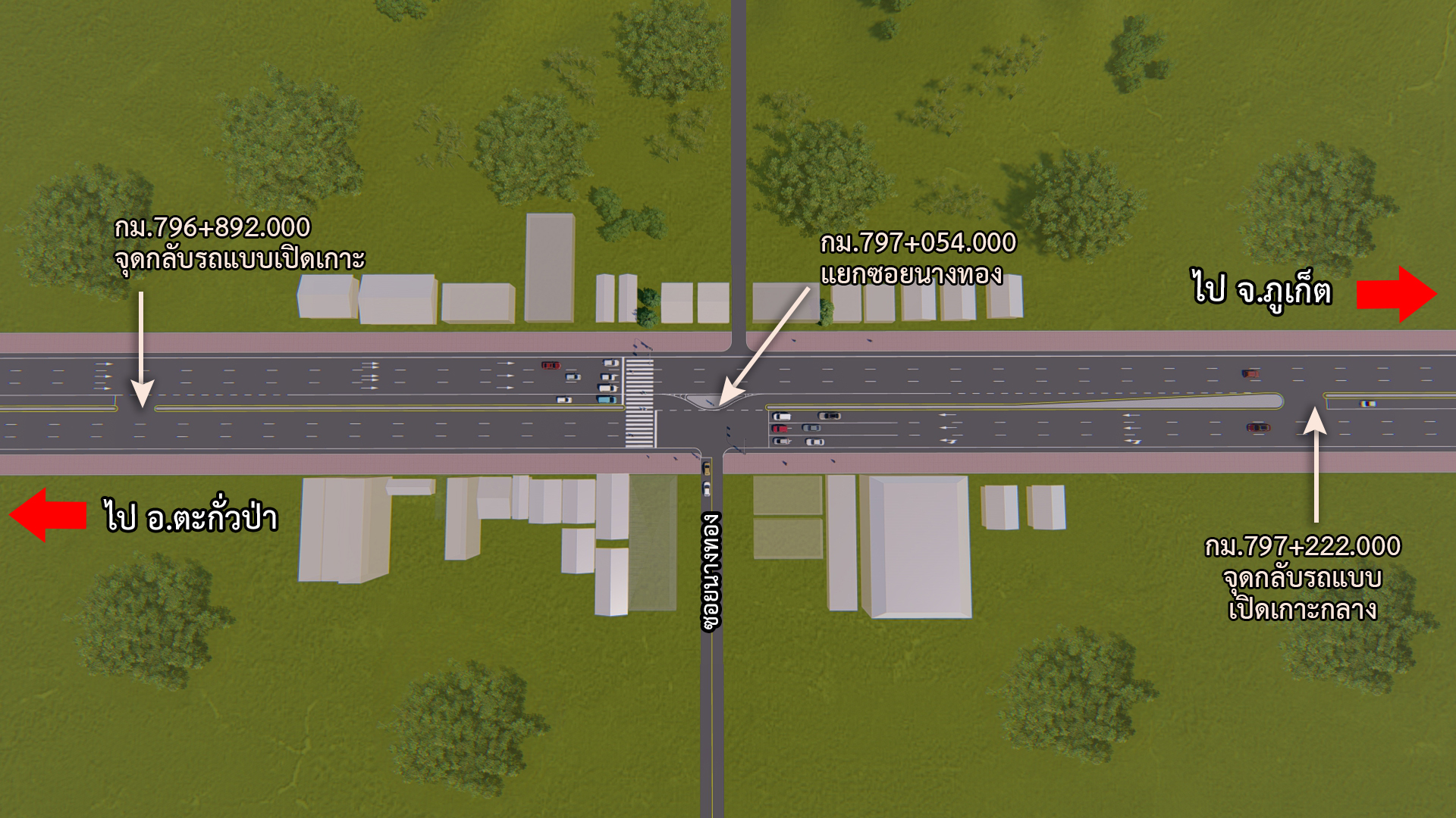 ??1. รูปแบบจุดกลับรถระดับพื้นราบจำนวน 2 แห่งคือ กม. 796+892 และ กม. 797+222 เป็นจุดกลับรถแบบเปิดเกาะกลางบริเวณด้านหัวและด้านท้ายแยกซอยนางทอง และ กม. 801+870 จุดกลับรถแบบเปิดเกาะบริเวณบ้านเขาหลักเพื่อรองรับรถที่จะเลี้ยวรถเข้าซอยเขาหลัก