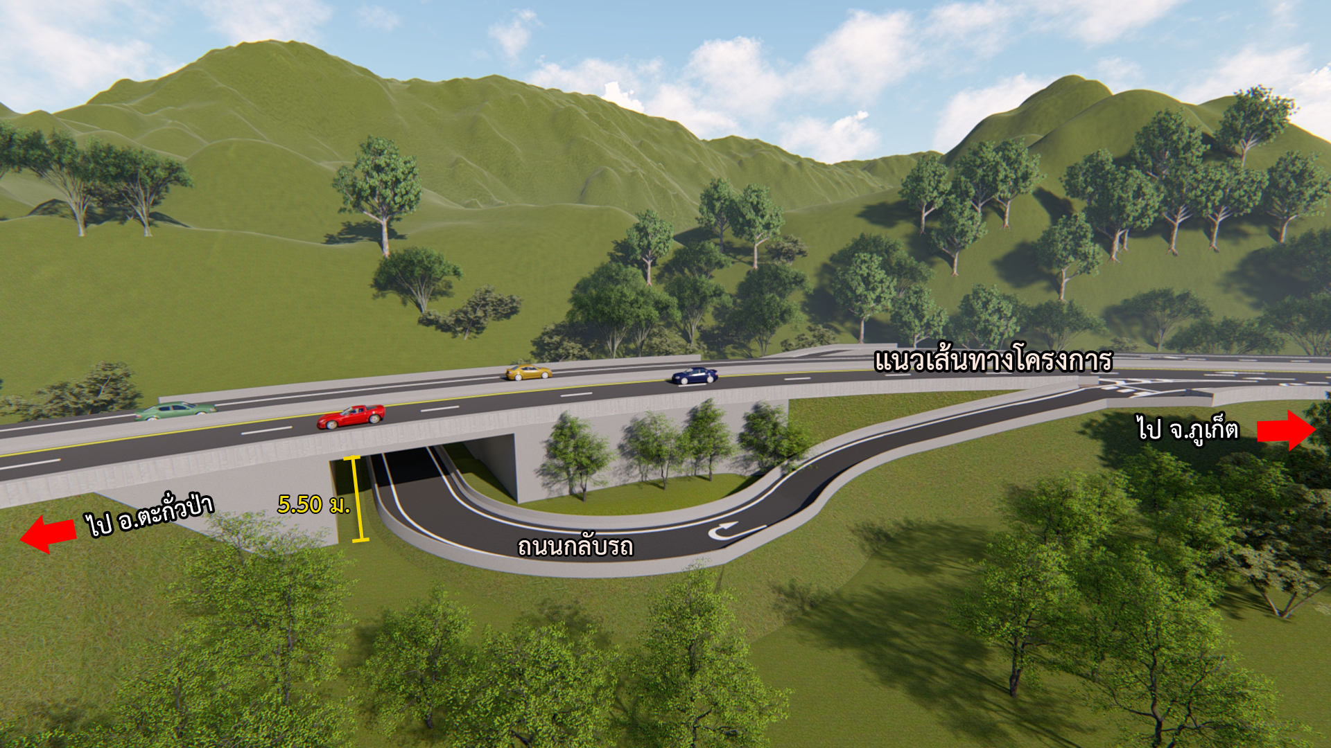 ??2. รูปแบบสะพานทางลอดสำหรับกลับรถ จำนวน 3 แห่ง 1) กม. 798+090.000 ความสูงช่องลอด 2.50 เมตร 2) กม. 800+330.000 บริเวณบ้านหาดเล็ก ความสูงช่องลอด 5.50 เมตร และ 3) กม. 800+047.500 ความสูงช่องลอด 5.50 เมตร