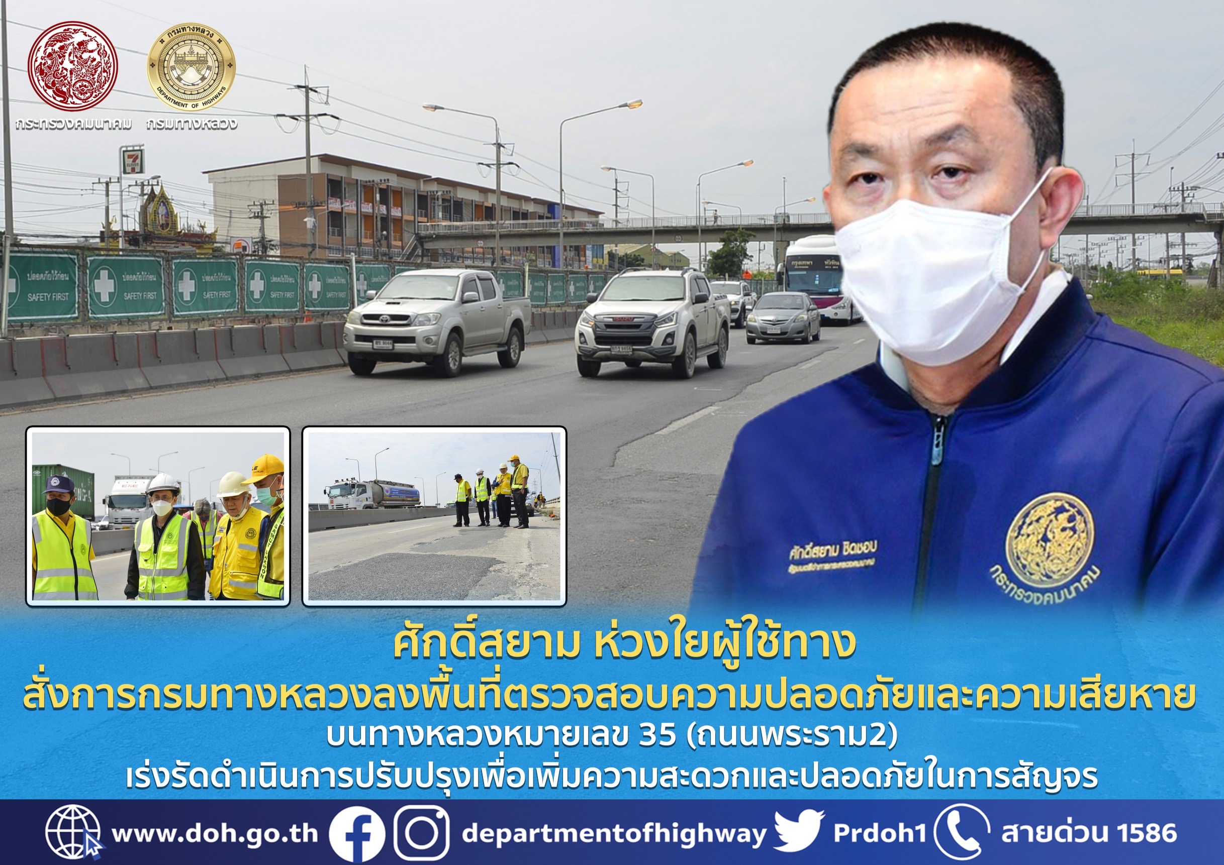 วันนี้ (17 ตุลาคม 2565) นายสราวุธ ทรงศิวิไล อธิบดีกรมทางหลวง มอบหมายให้ นายไพฑูรย์ พงษ์ชวลิต รองอธิบดีกรมทางหลวงฝ่ายดำเนินงาน พร้อมด้วย นายทวีศักดิ์ รุจิจรรยาวัฒน์ ผู้อำนวยการสำนักก่อสร้างสะพาน นายพรพรต สุริยนต์ ผู้อำนวยการสำนักงานทางหลวงที่ 13 (กรุงเทพ) นายประลองยุทธ์ กสิวงศ์ ผู้อำนวยการแขวงทางหลวงสมุทรสาคร และเจ้าหน้าที่ที่เกี่ยวข้อง ลงพื้นที่ตรวจสอบความปลอดภัยและความเสียหายบนทางหลวงหมายเลข 35 (ถนนพระรามที่ 2) ตามนโยบายท่านรัฐมนตรีว่าการกระทรวงคมนาคม ในการอำนวยความสะดวกและความปลอดภัยแก่ประชาชนผู้ใช้ทาง จากการลงพื้นที่ตรวจสอบครั้งนี้ มีการตรวจสอบผิวจราจรที่เกิดความเสียหายและสั่งการให้หน่วยงานที่เกี่ยวข้อง เตรียมความพร้อม จัดบุคลากร เครื่องมือ เครื่องจักร วัสดุ อุปกรณ์ และเร่งรัดดำเนินการซ่อมแซมผิวจราจรบริเวณดังกล่าวโดยเร็วที่สุด ทั้งนี้ในด้านความปลอดภัยได้มอบหมายให้สำนักก่อสร้างสะพานวางแผนดำเนินงานตามคู่มือแนวทางปฏิบัติด้านความปลอดภัยในระหว่างการก่อสร้าง โดยติดตั้งแบริเออร์และแผงผ้าใบพร้อมติดตั้งไฟฟ้าสัญญาณและไฟแสงสว่างเพื่อเป็นแนวกั้นพื้นที่การทำงานให้มีขอบเขตชัดเจน อีกทั้งดำเนินการทำความสะอาดแนวแบริเออร์และแผงผ้าใบตลอดโครงการก่อสร้าง เพื่อสร้างทัศนวิสัยในการขับขี่ที่ดี และเพิ่มประสิทธิภาพในการลดอุบัติเหตุ