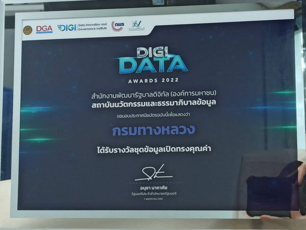 วันที่ 7 พฤศจิกายน 2565 เวลา 09.00 น. ณ ห้อง The Grand Arnoma โรงแรมอโนมา แกรนด์ กรุงเทพฯ นายสราวุธ ทรงศิวิไล อธิบดีกรมทางหลวง มอบหมายให้ นายเด่นชัย เอี่ยมสุวรรณ ผู้อำนวยการศูนย์เทคโนโลยีสารสนเทศ เป็นผู้แทนกรมทางหลวง เข้ารับมอบรางวัล การเผยแพร่ข้อมูลเปิดยอดเยี่ยมแห่งปี “โครงการ DIGI DATA AWARDS 2022 งานมอบรางวัลให้กับหน่วยงานที่เปิดเผยชุดข้อมูลเปิดภาครัฐ” สำหรับ ทล. ได้รางวัลชุดข้อมูลเปิดทรงคุณค่า ซึ่งจัดโดย สำนักงานพัฒนารัฐบาลดิจิทัล (องค์การมหาชน) โดยสถาบันนวัตกรรมและธรรมาภิบาลข้อมูล เพื่อเป็นการกระตุ้นให้เกิดขับเคลื่อนรัฐบาลดิจิทัลภายใต้แนวคิด “Data Driven Organization” โดยปัจจัยสำคัญในการขับเคลื่อนดังกล่าวคือการเปิดเผยชุดข้อมูลที่ภาครัฐจัดเก็บและรวบรวมไว้นำมาเผยแพร่ให้กับประชาชน
