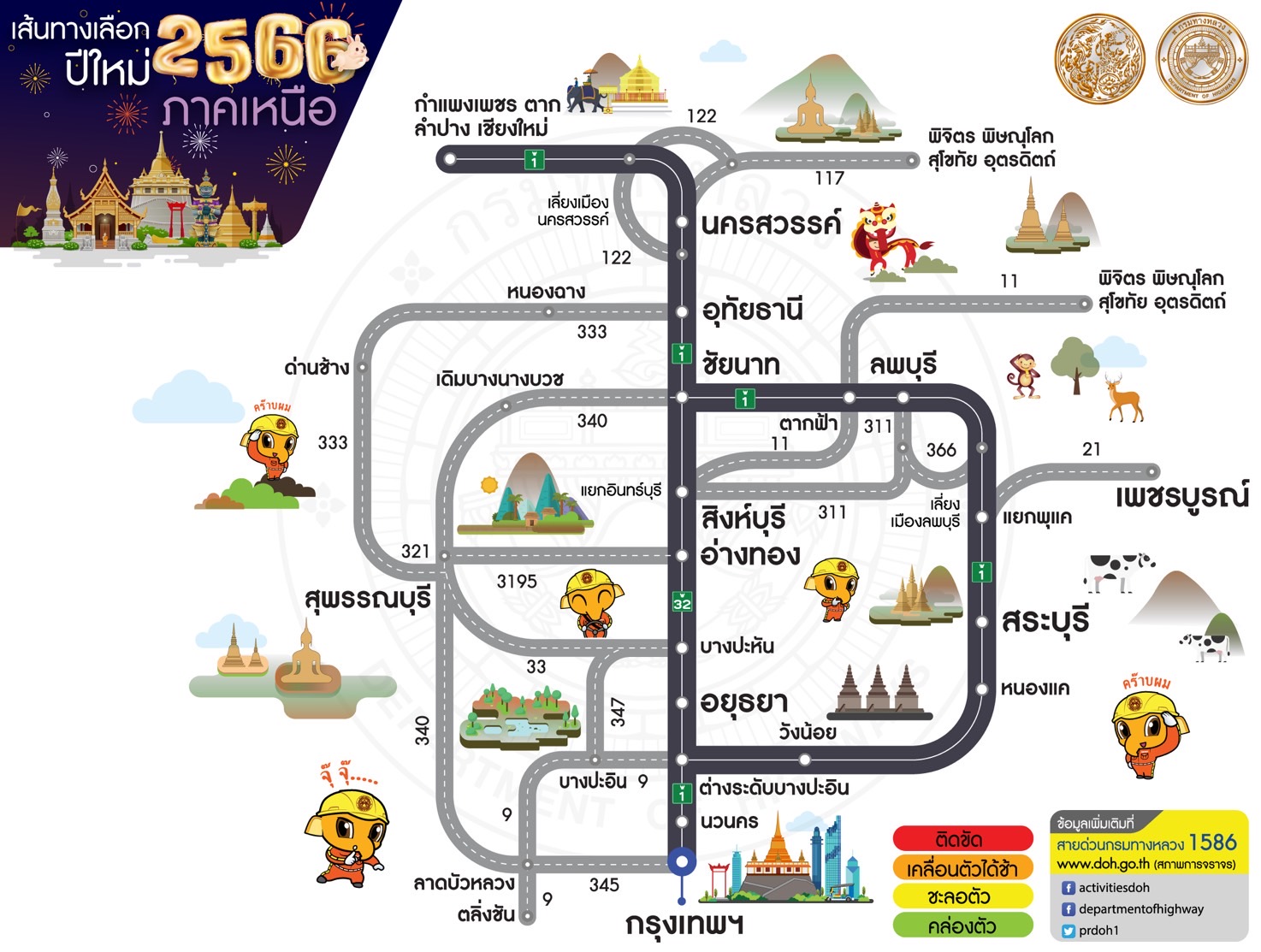 นายสราวุธ ทรงศิวิไล อธิบดีกรมทางหลวง เปิดเผยว่า ในช่วงเทศกาลปีใหม่ระหว่างวันที่ 30 ธันวาคม 2565 – 2 มกราคม 2566 เพื่อเป็นการอำนวยความสะดวกแก่ผู้เดินทางและหลีกเลี่ยงปัญหาการจราจรติดขัดในช่วงเทศกาลดังกล่าว ตามข้อสั่งการของนายศักดิ์สยาม ชิดชอบ รัฐมนตรีว่าการกระทรวงคมนาคม ที่มีความห่วงใยประชาชนในการเดินทาง กรมทางหลวงจึงได้แนะนำเส้นทางเลือกบนทางหลวงสายหลักและสายรอง ซึ่งจะช่วยให้ประชาชนวางแผนการเดินทางล่วงหน้าได้เป็นอย่างดี ดังนี้