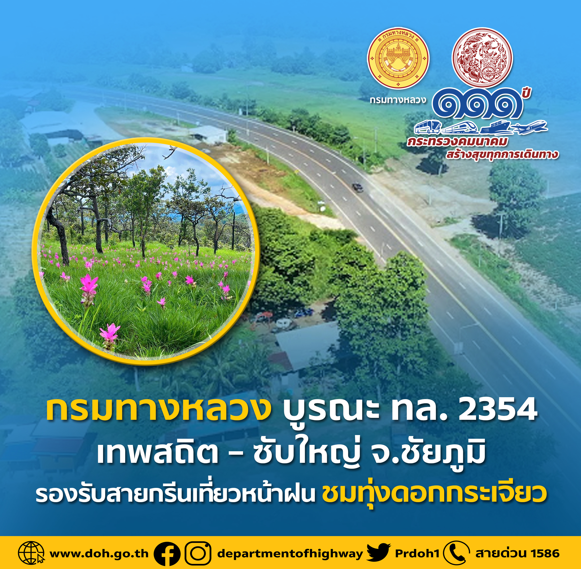 กรมทางหลวง ดำเนินการบูรณะ ทล.2354 ตอน เทพสถิต – ซับใหญ่ ตอน 2 (ช่วงทางแยกที่จะไปทุ่งดอกกระเจียว) เพื่อรองรับนักท่องเที่ยวที่เดินทางมาท่องเที่ยว ณ อุทยานแห่งชาติป่าหินงาม  จังหวัดชัยภูมิ ชมทุ่งดอกกระเจียว ซึ่งเป็นหนึ่งในสถานที่ชมดอกไม้ที่มีชื่อเสียงของไทย ที่ออกดอกในฤดูฝนของทุกปีให้ชื่นชมปีละครั้งเท่านั้น พร้อมทั้งดำเนินการเตรียมความพร้อมปรับปรุงทางหลวงให้สวยงาม  ตามนโยบายของกระทรวงคมนาคม ที่มุ่งเน้นการกำกับดูแลการพัฒนาระบบคมนาคมให้มีความสะดวก ปลอดภัย เพื่อส่งเสริมเศรษฐกิจ การท่องเที่ยว กระจายรายได้สู่ชุมชน เพื่อให้ประชาชนมีคุณภาพชีวิตที่ดี และสนับสนุนการพัฒนาประเทศอย่างยั่งยืน