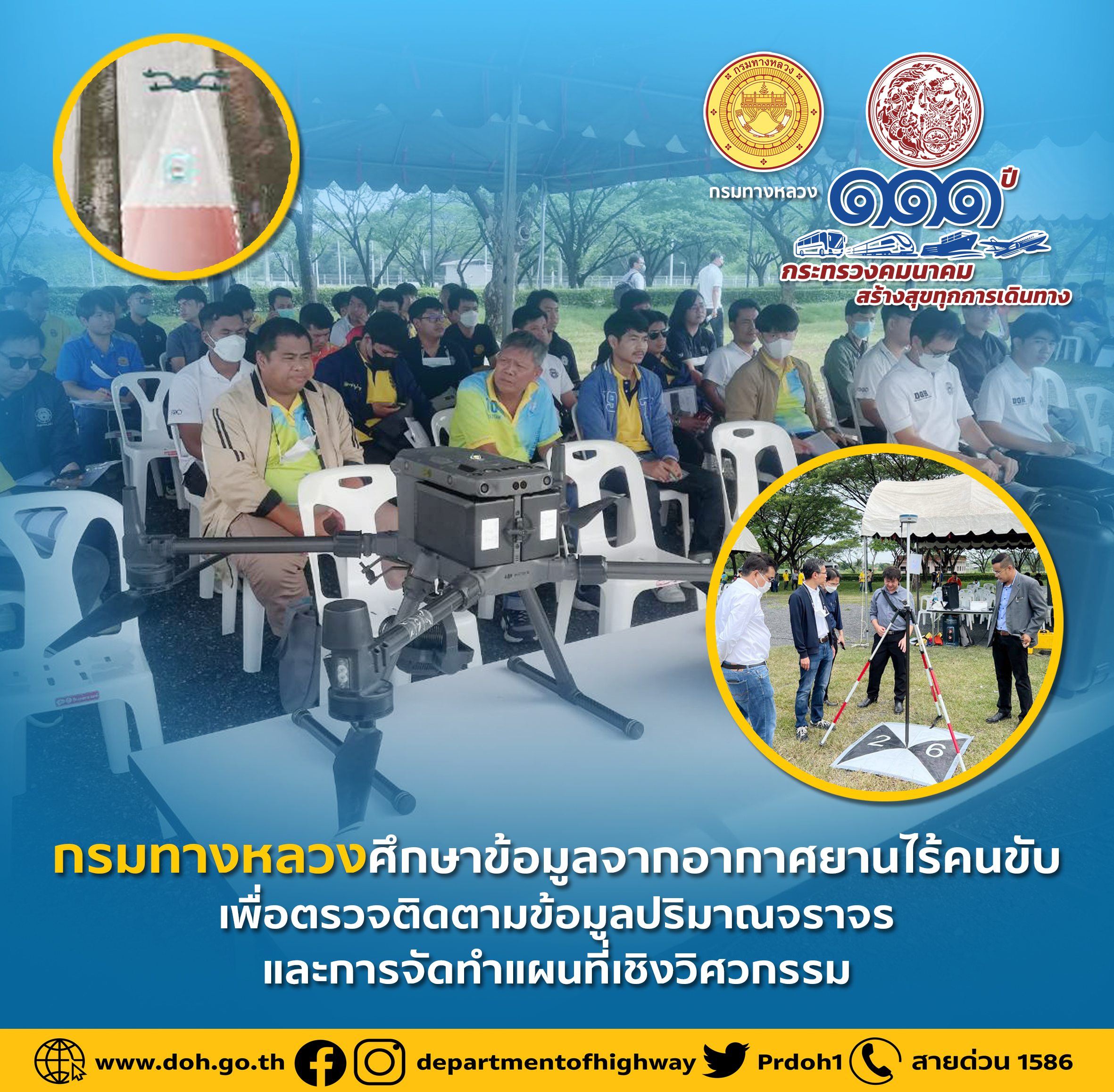 กรมทางหลวง โดยสำนักวิจัยและพัฒนางานทางได้ดำเนินการโครงการข้อมูลจากอากาศยานไร้คนขับเพื่อตรวจติดตามข้อมูลปริมาณจราจรและการจัดทำแผนที่เชิงวิศวกรรม โครงการนี้มีจุดมุ่งหมายเพื่อศึกษา วิจัย และพัฒนา การประยุกต์ใช้อากาศยานไร้คนขับในภารกิจในด้านต่างๆ ของกรมทางหลวง โดยเป็นการปรับเปลี่ยนจากการใช้อุปกรณ์เทคโนโลยีอากาศยานไร้คนขับที่ใช้เพียงภาพถ่าย หรือภาพเคลื่อนไหว มาเป็นการวิเคราะห์ข้อมูล อย่างเป็นระบบของกรมทางหลวงให้สามารถจัดทำข้อมูลเชิงวิศวกรรมในด้านต่างๆ ให้เกิดประโยชน์ มีมาตรฐาน ที่เป็นประโยชน์ในภารกิจ ของกรมทางหลวงทั้งในปัจจุบัน และในอนาคตได้