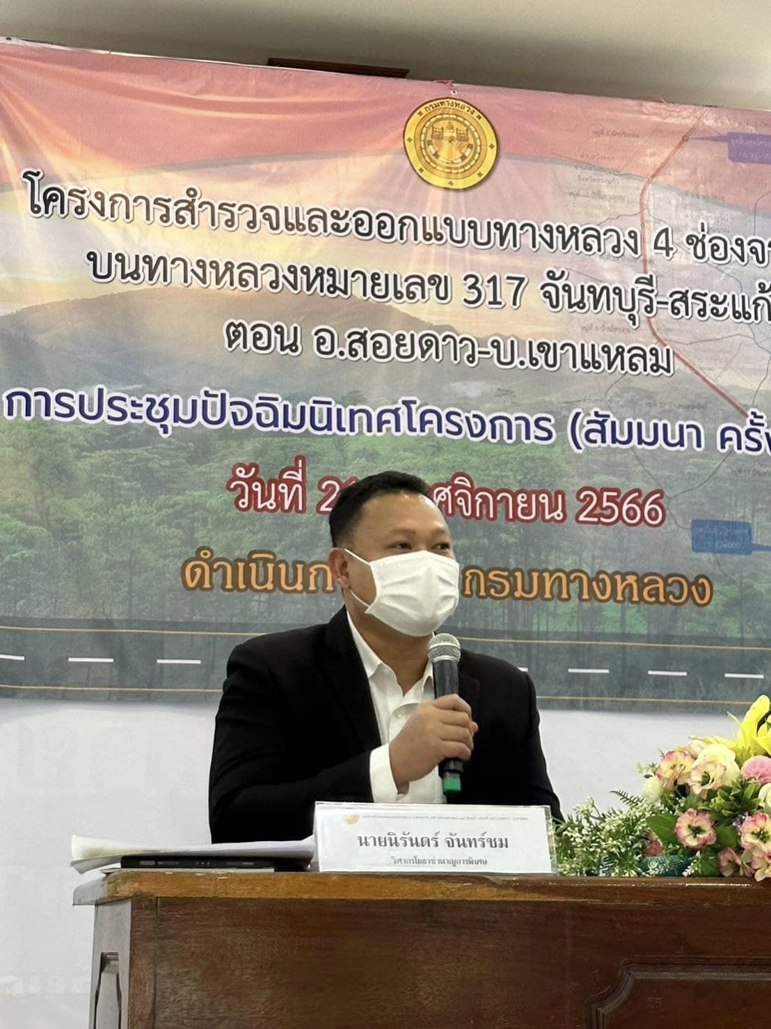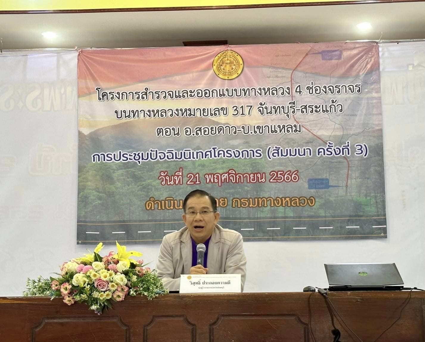 วันอังคารที่ 21 พฤศจิกายน 2566 เวลา 8:30 – 16:00 น. กรมทางหลวง โดยสำนักสำรวจและออกแบบ ร่วมจัดประชุมปัจฉิมนิเทศ (สัมมนาครั้งที่ 3) โครงการสำรวจและออกแบบทางหลวง 4 ช่องจราจรบนทางหลวงหมายเลข 317 จันทบุรี - สระแก้ว ตอน อ.สอยดาว - บ.เขาแหลม ระหว่าง กม.82+000 - กม.91+000 โดยมีนายนิรันดร์ จันทร์ชม วิศวกรโยธาชำนาญการพิเศษ และเจ้าหน้าที่จากสำนักสำรวจและออกแบบ การนี้ นายคมกฤต ดีจังวิภาต ผู้อำนวยการแขวงทางหลวงจันทบุรี และนายพรพิชิต กลิ่นมาลี ผู้อำนวยการแขวงทางหลวงสระแก้ว ได้เข้าร่วมการประชุมด้วย โดยมี นายวิสุทธิ์ ประกอบความดี รองผู้ว่าราชการจังหวัดจันทบุรี และนายสมบัติ เสียมทอง นายอำเภอวังสมบูรณ์ ให้เกียรติเป็นประธาน ณ ห้องประชุมสหกรณ์โคนม อำเภอสอยดาว จังหวัดจันทบุรี และ ห้องประชุมที่ว่าการอำเภอวังสมบูรณ์ อำเภอวังสมบูรณ์ จังหวัดสระแก้ว